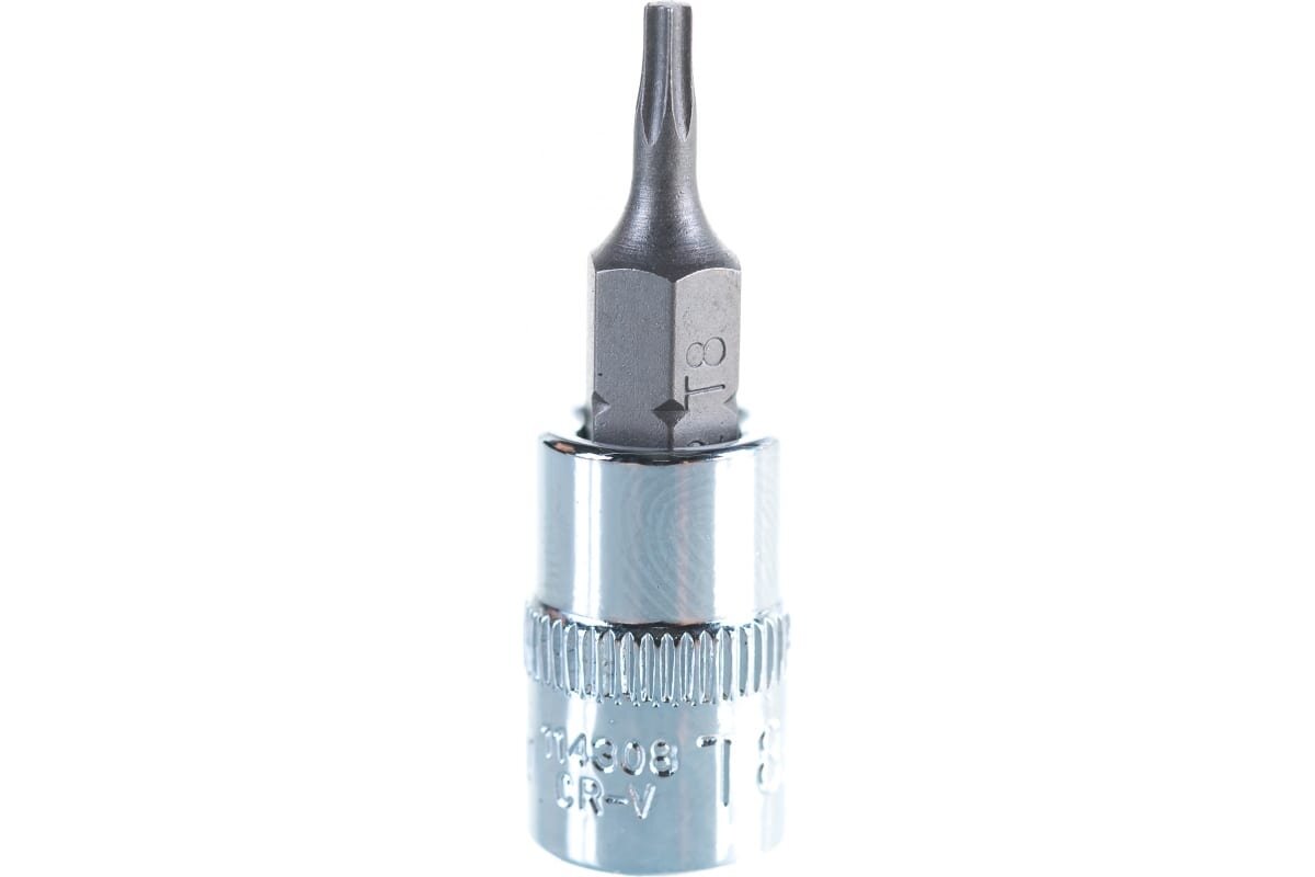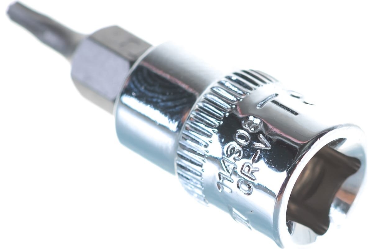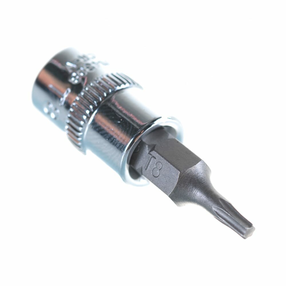 Насадка торцевая с вставкой-битой OMBRA 1/4"DR, T8. Приспособление используется для откручивания различного крепежа, к которому относятся гайки, болты и т. д. Оснастка просто незаменима в случаях, когда крепеж расположен в труднодосягаемом месте, где работа с гаечными ключами не удобна. Торцевые головки подходят для ударных нагрузок и обладают лучшим крутящим моментом по отношению к резьбе, чем другой подобный инструмент. Материал оснастки хром-ванадиевая сталь, что обеспечивает ее высокую прочность и стойкость к нагрузкам и механическим воздействиям. Еще одной особенностью торцевой головки является хромоникелевое покрытие, за счет которого с поверхности оснастки легко удаляются все видимые загрязнения и она не подвергается коррозии.