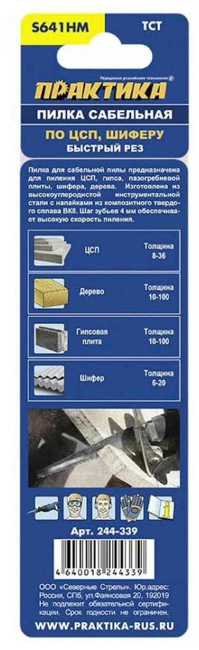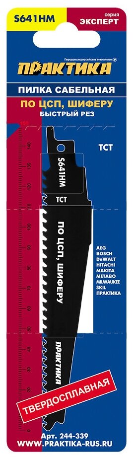 Пилка для лезвийной (сабельной) пилы ''Практика 244-339'' тип ''S641HM'' предназначена для пиления минеральных материалов: газо-пенобетона до 100мм, силикатного кирпича, ЦСП, шифера; дерева, толстого ДСП, пакетов материалов; имеет узкое полотно с напайками из карбида вольфрама ВК8. Обеспечивает высокую скорость пиления. Длина общая/рабочая: 150/130 мм. Шаг зубов: 4 мм. Ширина пропила: 2 мм.