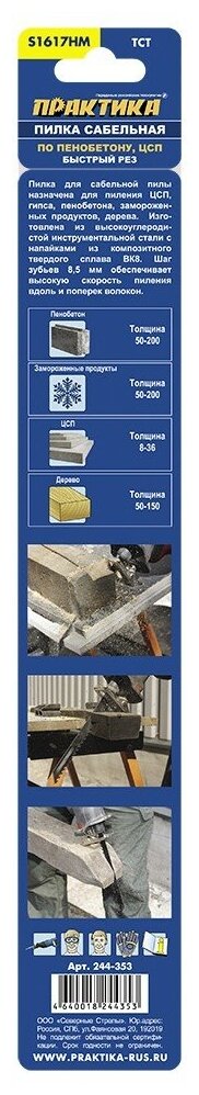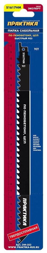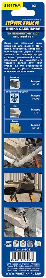 | Прочие характеристики и свойства | Пилка для лезвийной (сабельной) пилы Практика 244-353 тип S1617HM предназначена для пиления минеральных материалов:газо-пенобетона до 250 мм, силикатного кирпича, ЦСП, шифера; дерева, толстого ДСП, пакетов материалов, замороженных продуктов. Имеет узкое удлиненное полотно с напайками из карбида вольфрама ВК8. Обеспечивает высокую скорость пиления, как поперек, так и вдоль волокон. Длина общая/рабочая 305/285мм, шаг зубов 8,5мм, ширина пропила >2,2 мм. |