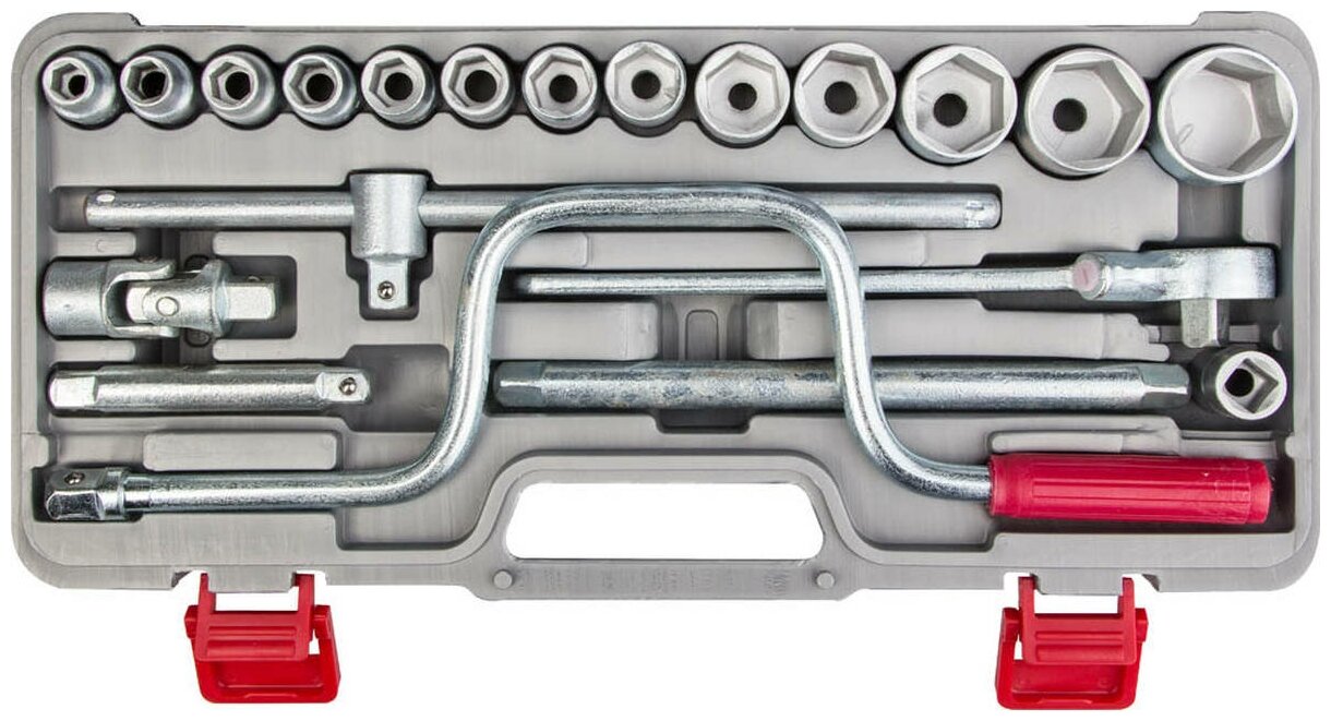 | Инструменты в комплекте | 13 сменных головок с присоединительным квадратом 1/2" (12.5 мм), два ключа, два удлинителя, коловорот и шарнир |