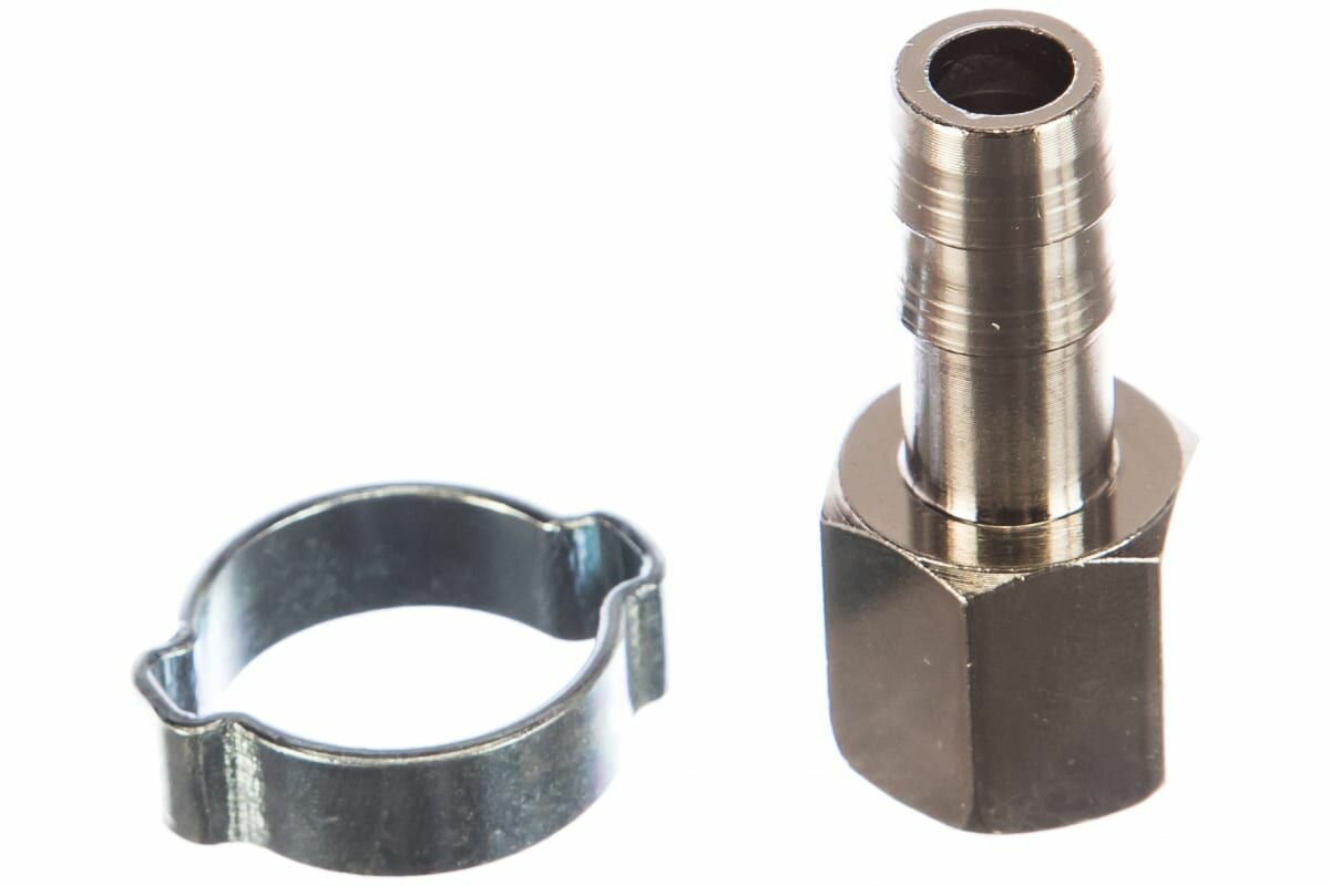 Для соединения компрессора шлангом с пневмоинструментом. Крепление к инструменту - резьба 1/4" (мама), к шлангу - "елочка" (10 мм). Обжимное кольцо 10х15 мм в комплекте.