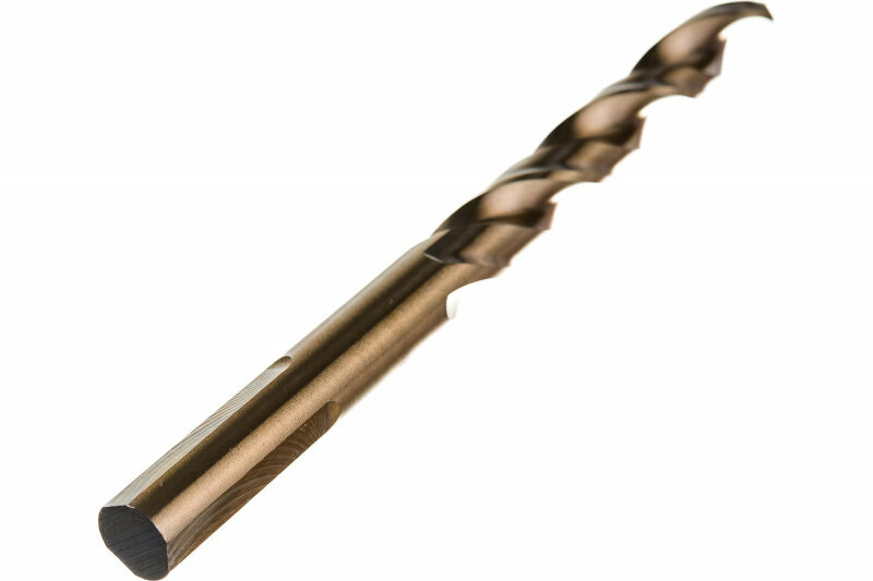 Высокоэффективное индустриальное быстрорежущее сверло по металлу с 8% примесью кобальта в сплаве. Золотистое оксидное покрытие обеспечивает эффективную защиту от перегрева, увеличивая срок службы. Обеспечивает чистый рез без заусенцев, идеальный вариант для работы с листовой сталью. Высокая стойкость к изломуПреимущества Материал: 92% быстрорежущая сталь HSS-E и 8% кобальта CO Отличные рабочие показатели при сверлении металлических изделий, включая нержавеющую сталь Отличный вариант для сверления листового металла, где требуются чистые и точные отверстия Хорошо переносит сверление на больших скоростях, выдерживает большие температуры благодаря особому оксидному покрытию, которое защищает от перегрева и в целом увеличивает срок службы сверла Специальная форма сверла с двумя резцами по краям и высокое качество изготовления позволяет добиться более точного и быстрого сверления без предварительного накернирования Постепенно увеличивающаяся по направлению к хвостовику толщина сердечника для наибольшей стойкости на излом Многогранная фрезерованная поверхность хвостовика исключает вероятность проскальзывания сверла в патроне Лазерная маркировка с размещением вне области зажима