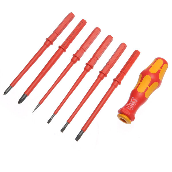 | Прочие особенности и свойства | 6 сменных отверток VDE с ручкой-держателем 817 VDE Kraftform в прочной поясной сумке. Инструменты проверены поштучно по стандарту IEC 60900. Поштучная проверка в водяной бане под напряжением 10000 В для безопасной работы на оборудовании с максимально допустимым напряжением 1000 В. Ручка- держатель 817 VDE Kraftform, исключительно для сменных отвёрток WERA VDE Сменные отвёртки VDE (длина154 мм) Набор из 7 предметов |
