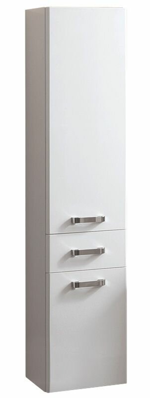 Корпус подвесного шкафа-колонны выполнен из влагостойкого ДСП материала с ламинированным покрытием. В шкафу размещается корзина для белья, за верхним фасадом скрываются стеклянные полки, а в центре расположен выдвижной ящик. Основные характеристики: