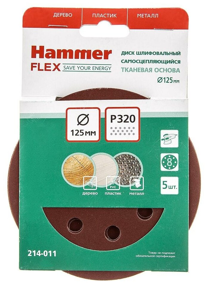 Круг шлиф. самосцепляющийся Hammer 214-011 Д125мм P320 8отв. цена за упаковку 5штВ блистереТехническая тканевая основа:- высокая прочность, гибкость и износостойкость;- водостойкая пропитка;- низкое растяжение основы при работе;- грунтование – нанесения покрытия на нерабочую обратную сторону.Связующий состав:- искусственная смола, обладающая повышенной износоустойчивостью;- оптимальное отведение тепла от зерна в процессе работы;- оптимально подобраны характеристики эластичности и жесткости.Шлифовальный (абразивный) материал:- синтетический материал оксид алюминия (электрокорунд Al2O3) - высокая твердость, стойкость (прочность) и острые края зерна;- самозатачивание зерна в процессе шлифования;- синтетическое покрытие зерна увеличивает срок службы и усиливает шлифовальные свойства (стойкость к разрушению зерна).