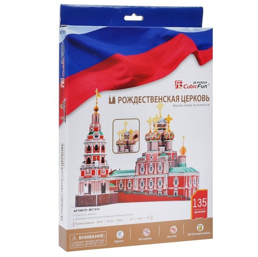 Замечательная серия конструкторов-головоломок Cubic Fun познакомит Вашего с ребенка с величайшими памятниками архитектуры со всего мира. На этот раз юному архитектору нужно своими руками воссоздать красивейшую Рождественскую церковь, которая расположена в Нижнем Новгороде. Здание поражает своим великолепием и яркостью красок, это пятиглавый храм, каждая их глав расположена к определенной стороне света, святыня из красного камня украшена белокаменной резьбой.