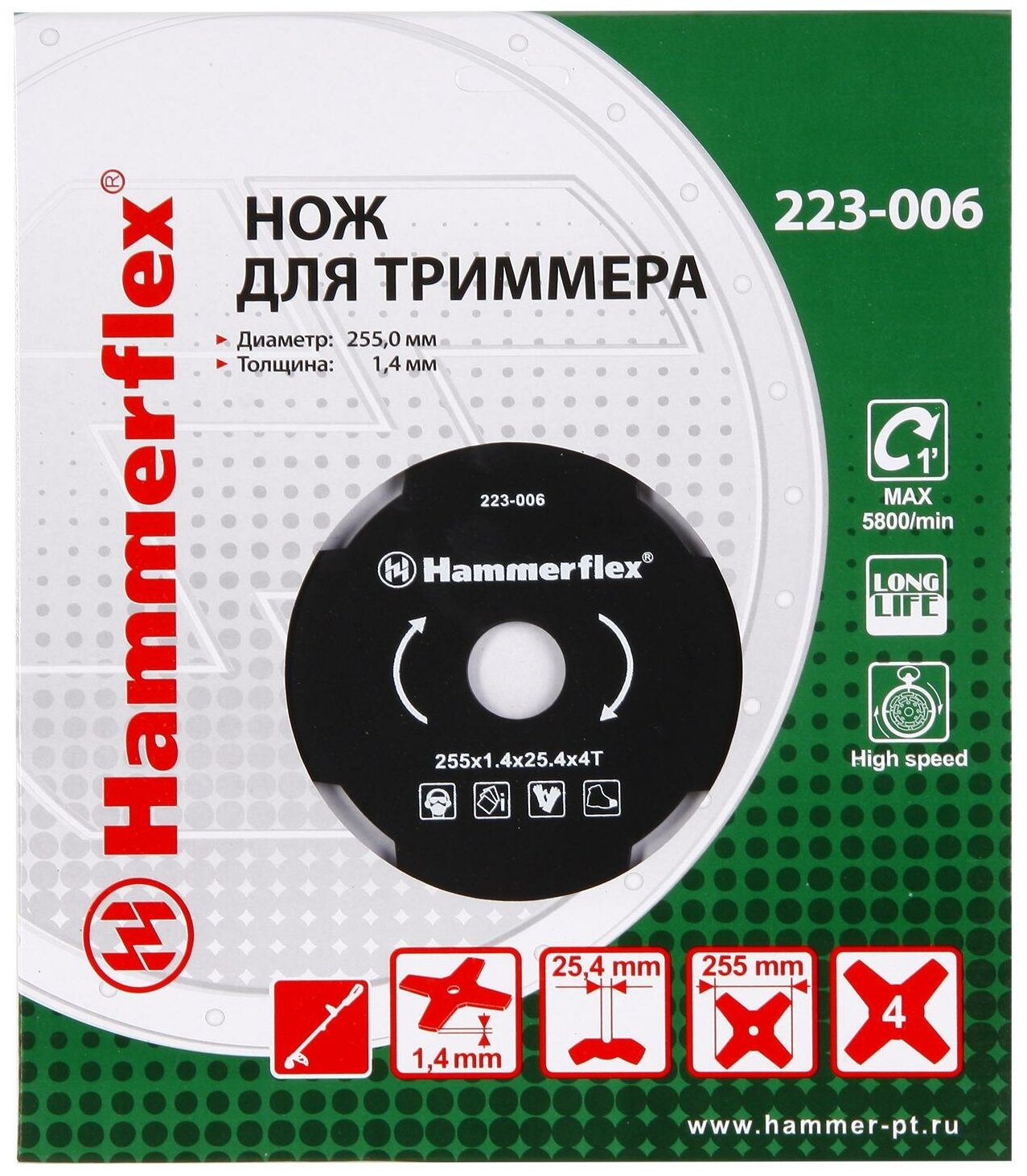 | Название на английском | Trimmer Blade Hammer Flex 223-006 hardened steel, 4 teeth, thikness 1,4 мм, d=255 мм |