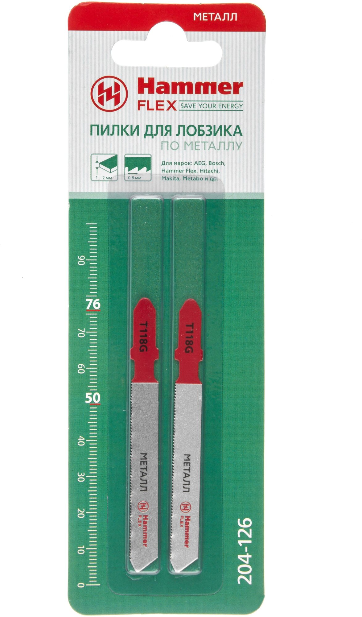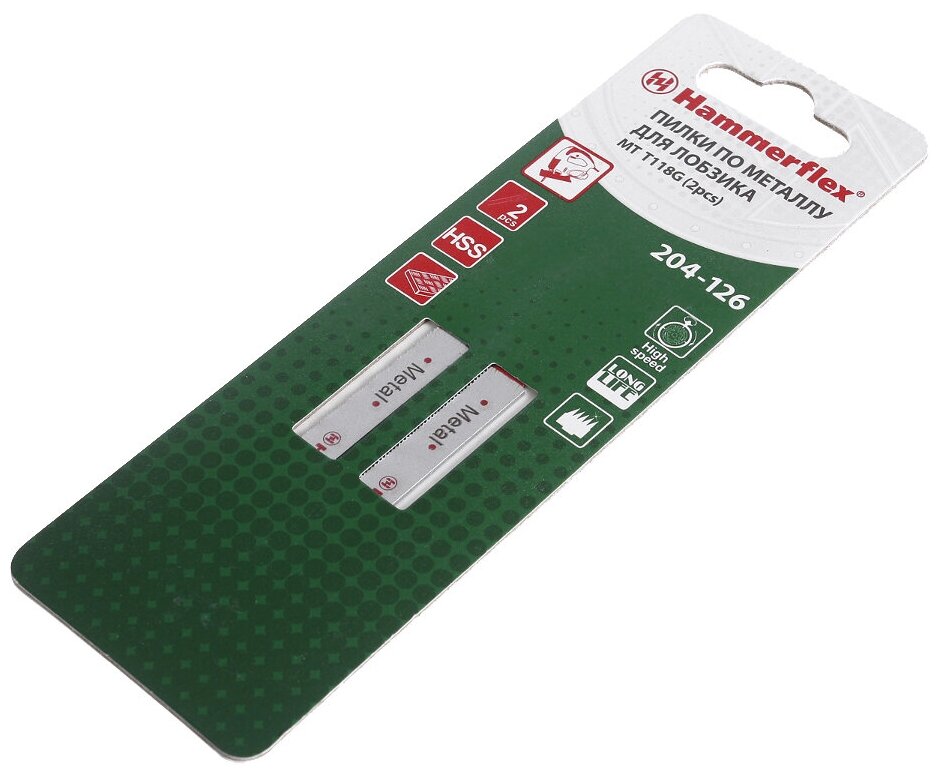 Пилки для лобзика HAMMER Пилка для лобзика Hammer Flex 204-126 JG MT T118G тонкий металл, 76мм, шаг 0.8, HSS, 2шт.Предназначены для пиления стали, цветных металлов, различных сплавов, а также пластмасс. — Изготовлены из качественной быстрорежущей стали HSS (High Speed Steel) и прослужат долго; — Остро заточенные, разведенные и отшлифованные зубья пилок обеспечивают точный рез; — Т-образный хвостовик совместим с большинством современных моделей электролобзиков.
