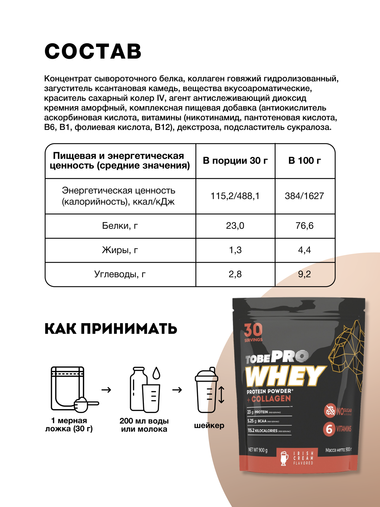 Как приумножить пользу от занятий спортом? Спортивное питание — залог успеха в работе над своим телом! Протеин с коллагеном на основе концентрата сывороточного белка поможет восстановиться после активной тренировки в зале и полезно перекусить в течение дня. Протеин для набора массы, похудения и сушки тела подходит для мужчин и женщин. Сывороточный протеин «TOBEPRO» – это: ✔ собственное производство и использование концентрата сывороточного белка (КСБ) высокого качества. ✔ 4 вкуса на выбор – «Ирландский крем», «Кофе капучино», «Клубника-банан» и «Соленая карамель». ✔ комплекс из 6 витаминов — В6, В1, фолиевая кислота, В12, никотинамид, пантотеновая кислота. Оптимальное содержание этих веществ в одной порции готового напитка гарантирует благоприятное воздействие на рост волос, их силу и блеск, улучшение памяти и концентрации, поддержание здоровья сердечно-сосудистой и нервной систем. ✔ высокое содержание белка. 76 г белка в 100 г смеси. ✔ гидролизованный коллаген. 3 г в 1 порции сохранят молодость и красоту вашей кожи, ногтей, волос и соединительных тканей в организме. ✔ сбалансированное питание без сахара, улучшенное пищеварение и поддержание физической формы. Протеин сывороточный «Соленая карамель» придает молочному напитку вкус сладко-соленого десерта. Продукт представлен в виде сухой смеси для создания вкусного молочного напитка: смешайте 30 г смеси (1 мерная ложка) с 200 мл молока и перемешайте содержимое в шейкере.