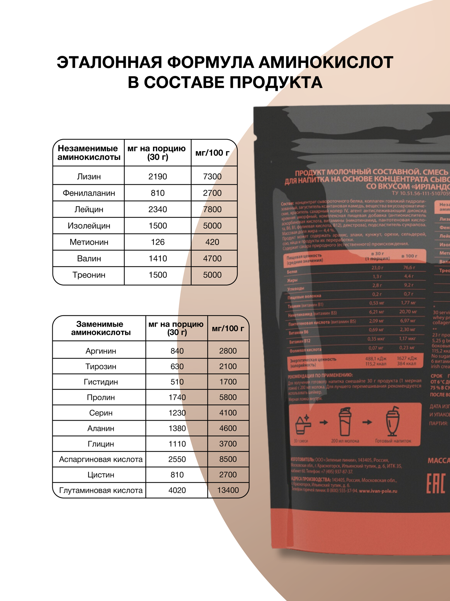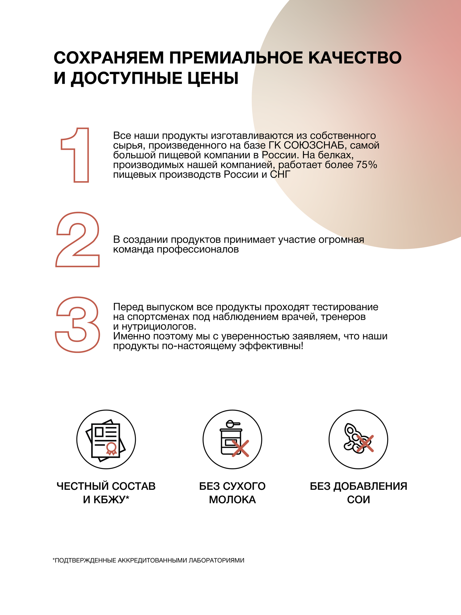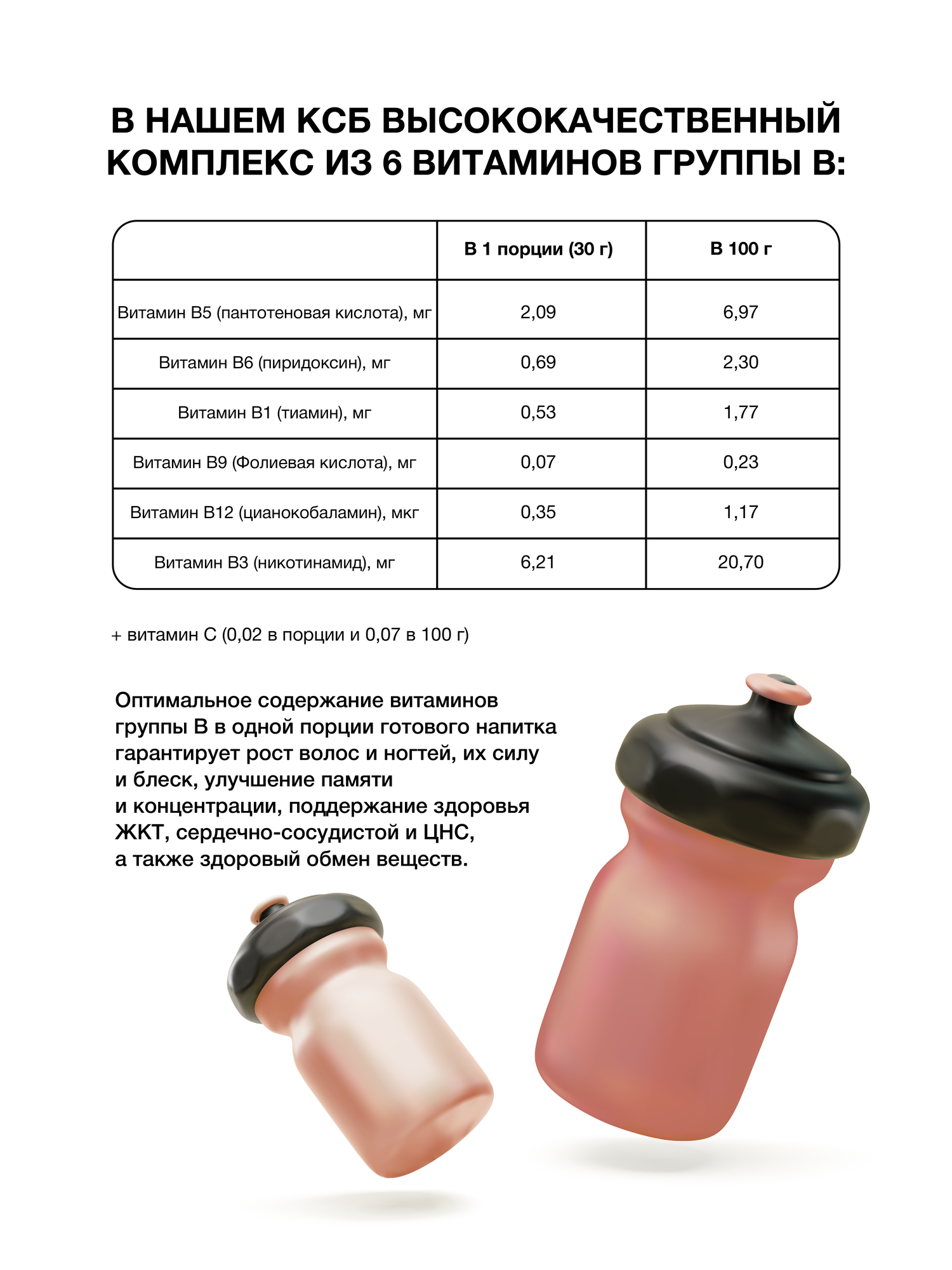 | Состав | Концентрат сывороточного белка, коллаген говяжий гидролизованный, соль, загуститель ксантановая камедь, вещества вкусоароматические, агент антислеживающий диоксид кремния аморфный, комплексная пищевая добавка (антиокислитель аскорбиновая кислота, витамины (никотинамид, пантотеновая кислота, В6, В1, фолиевая кислота, В12), декстроза), подсластитель сукралоза, ароматизатор. Содержит сахара природного (естественного) происхождения. |