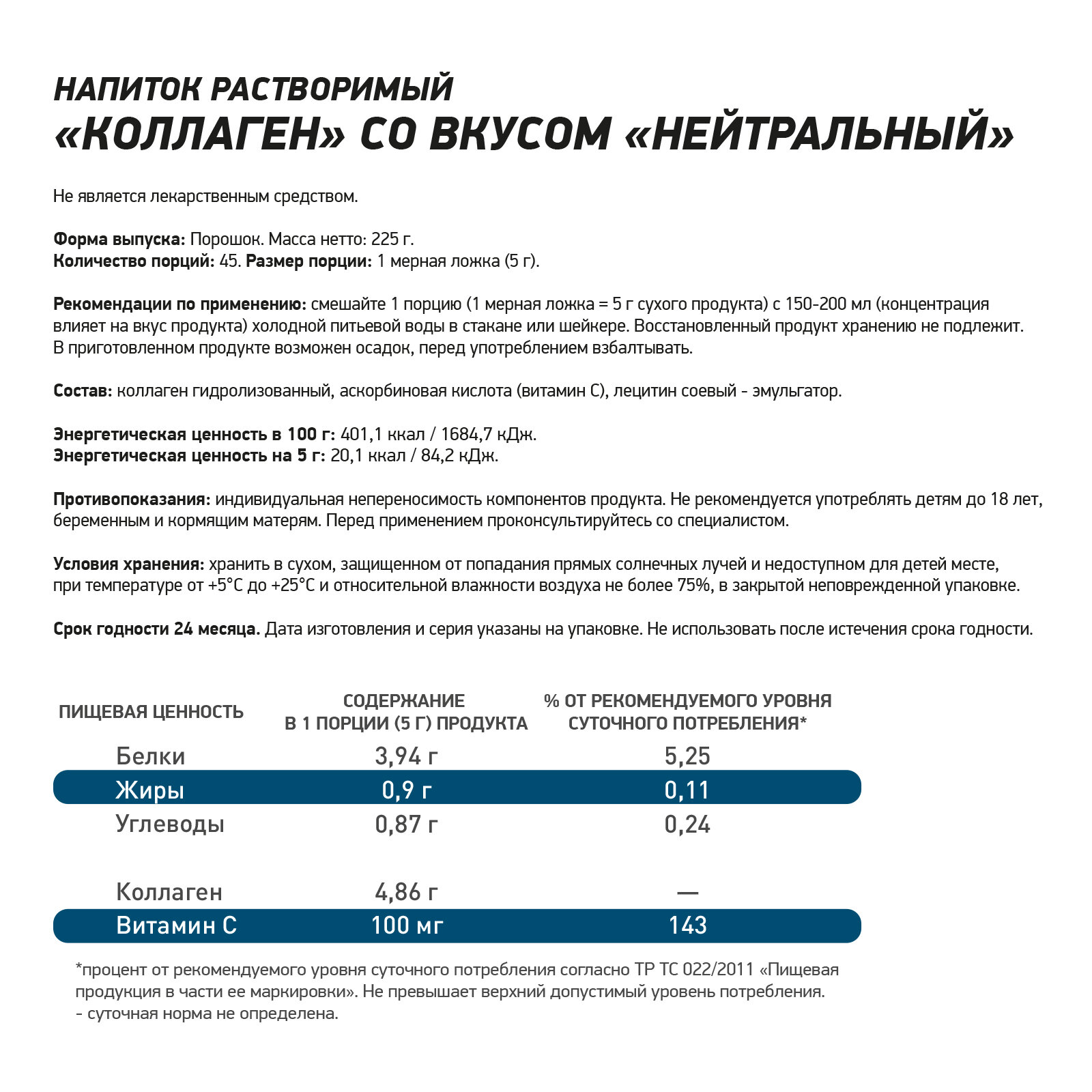 Коллаген абсолютно безвреден и при его приеме в адекватных дозах нет никаких побочных последствий. Прием коллагена можно сравнить с приемом витаминов, минералов и прочих полезных добавок, не содержащихся в достаточном количестве в натуральных продуктах. Его прием обязателен при восстановлении после травм и/или повреждений суставов и мышц. Для укрепления костей, связок и суставов, улучшение свойств кожи - коллаген рекомендуется принимать в дозе 10-20 г в сутки, за 1 или 2 приема в сухом виде, запивая водой, растворяя в воде или делая желе. Одна порция продукта (1 мерная ложка - 5 г) содержит: Белки: 3,65 г (4,87%*) Жиры: 0,1 г (0,12%*) Углеводы: 0,8 г (0,22%*) Коллаген: 4,5 г (-) Витамин С: 100 мг (166,6%**) * - процент от рекомендуемого уровня суточного потребления согласно ТР ТС 022/2011 "Пищевая продукция в части её маркировки", Приложение 2 ** - не превышает верхний допустимый уровень потребления согласно Методическим рекомендациям МР 2.3.1.1915-04. Ингредиенты: коллаген гидролизованный, ароматизатор пищевой, лимонная кислота - регулятор кислотности, аскорбиновая кислота (витамин С), сукралоза - подсластитель, краситель пищевой натуральный экстракт аннато. Смешайте 1 порцию (1 мерная ложка = 5 г сухого продукта) с 150-200 мл холодной питьевой воды в стакане или шейкере.
