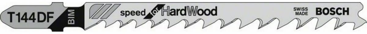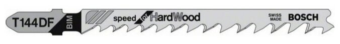 | Прочие характеристики и свойства | Лобзиковое пильное полотно T 144 DF Speed for Hard Wood позволяет выполнять быстрые прямые пропилы в древесине. Его разведенные остро заточенные зубья обеспечивают быстрые пропилы. Полностью закаленная полоска зубьев из HSS (быстрорежущая сталь) соединена с корпусом из высокоэластичной HCS (высокоуглеродистая сталь), что делает это биметаллическое (BIM) полотно пригодным для резки твердых материалов, например твердой древесины и абразивных древесных материалов. Крупный прогрессивный шаг зубьев (4–5,2 мм) этого полотна позволяет пилить различные материалы из массива дерева толщиной 5–50 мм. Для лобзиков с системами крепления с Т-образным хвостовиком. |
