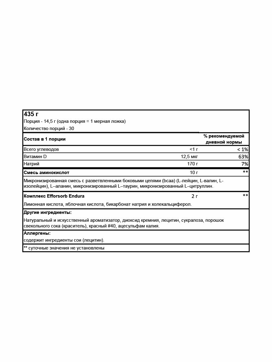 | Состав | Микронизированный L-лейцин; L-аланин; искусственный ароматизатор — "голубая малина"; микронизированный L-валин; микронизированный L-изолейцин; регуляторы кислотности: Е330, Е296; микронизированный L-таурин; микронизированный L-цитруллин; регулятор кислотности Е500i; антиокислитель Е322; антислеживатель Е551; пищевые красители: Е162, Е160а; подсластители |
