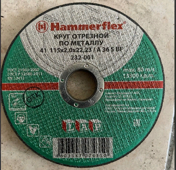 Круг отрезной HAMMER 115х2х22 упак. 25 шт.115 x 2.0 x 22,23 A 36 S BF Круг отрезной Hammer Flex 232-001 по металлу цена за 1 штВ виде шлифовального средства используется электрокорунд (Al2O3) со средней зернистостью (менее 0,6 мм), предназначенный для общих работ по обработке металла; + Используется связка улучшенной твердости с использованием синтетических смол с армированнием стекловолокном; +Допустимая скорость до 80м/с (13300 об./мин.) +Подобранное соотношение зерна и связки обеспечивает невысокую стоимость реза при высокой скорости;