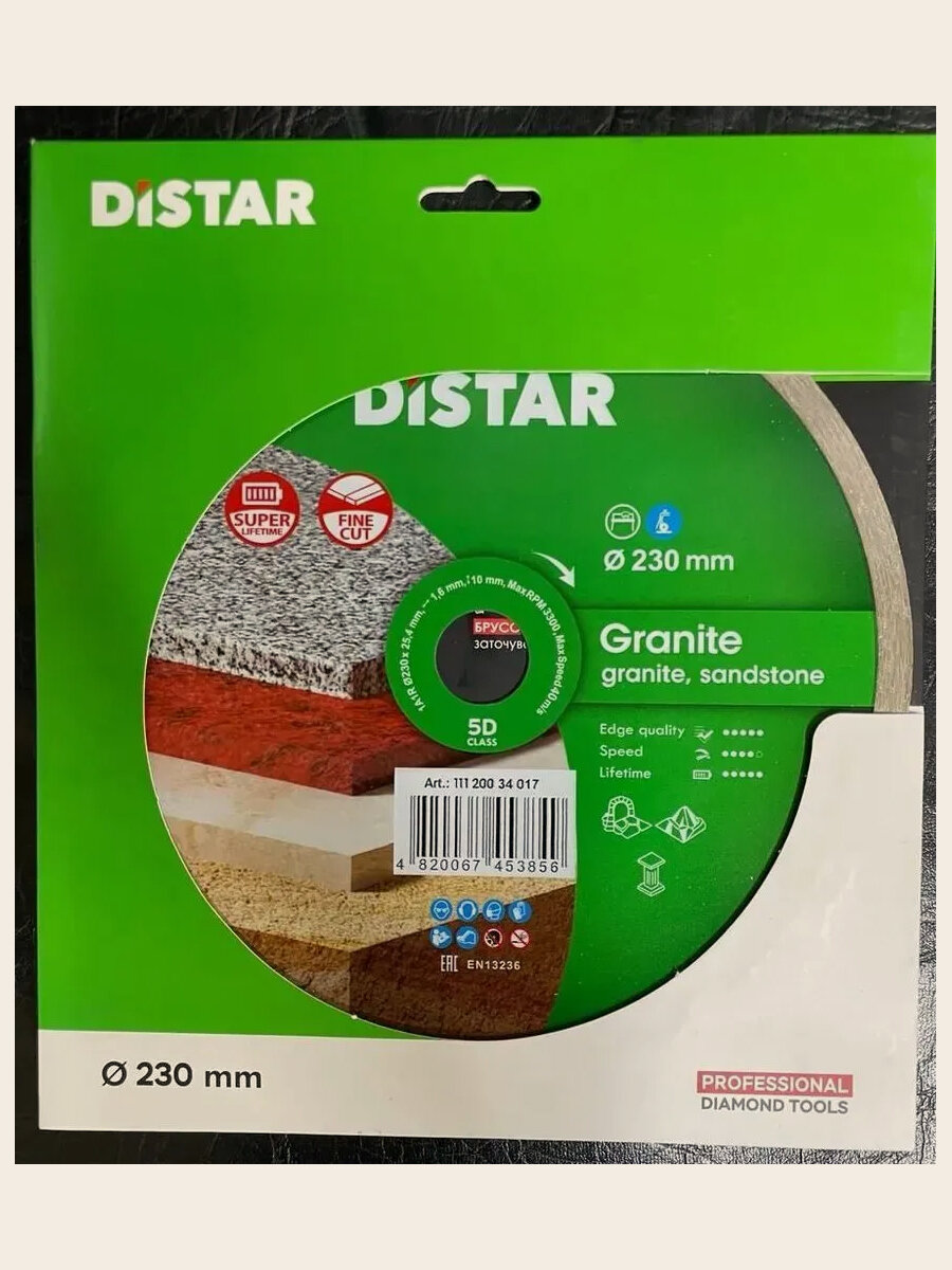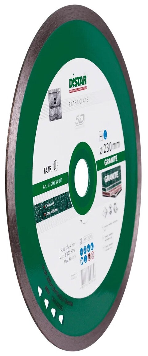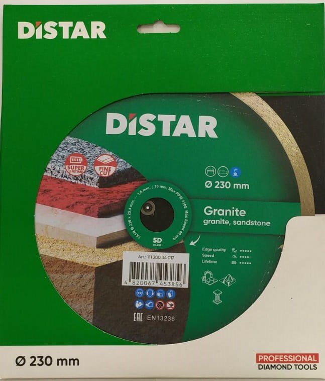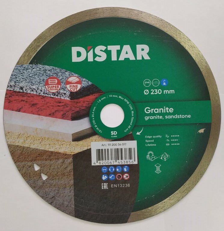 Инструмент алмазный, 1A1R 230 GRANITE, разработанный компанией "Ди-стар", создан для работы на плиткорезах с охлаждением. Диск предназначен для обработки таких материалов как песчаник, гранит, керамическая плитка и керамогранит. Эксплуатация диска должна проходить в оптимальных для резания условиях: с охладительной жидкостью и на плиткорезе с подходящей для круга мощности. Все виды гранита и песчаника режутся без труда, сколов и шероховатостей. Благодаря постоянному притоку жидкости диск может работать без перерыва 5-6 рабочих часов, ежедневно!