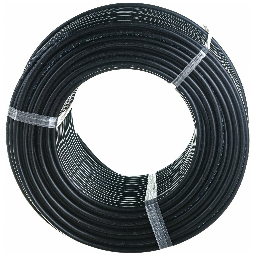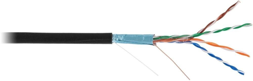 Кабель содержит 4 пары витых медных проводников, выполнен в экранированном исполнении, соответствует категории 5e и предназначен для внешней прокладки.