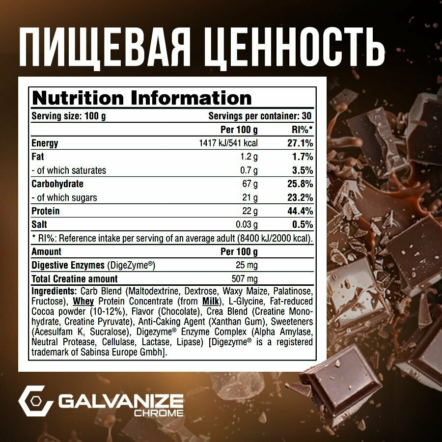 | Состав | Смесь углеводов (мальтодекстрин, декстроза, восковая кукуруза, палатиноза, фруктоза), концентрат белка молочной сыворотки, L-глицин, порошок какао с пониженным содержанием жира (10-12%), ароматизатор (шоколад, орех), креатиновая смесь (креатин моногидрат, креатин пируват), соль, агент антислеживающий (ксантановая камедь), подсластители (ацесульфам калия, сукралоза), ферментный комплекс Digezyme® (альфа-амилаза, нейтральная протеаза, целлюлаза, лактаза, липаза). |