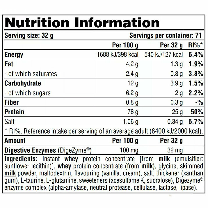 | Состав | Быстрорастворимый концентрат белка молочной сыворотки (эмульгатор: лецитин подсолнечный), концентрат белка молочной сыворотки, глицин, сухое обезжиренное молоко, мальтодекстрин, ароматизаторы, соль, загуститель (ксантановая камедь), L-таурин, L-глутамин, подсластители: ацесульфам калия, сукралоза; краситель |