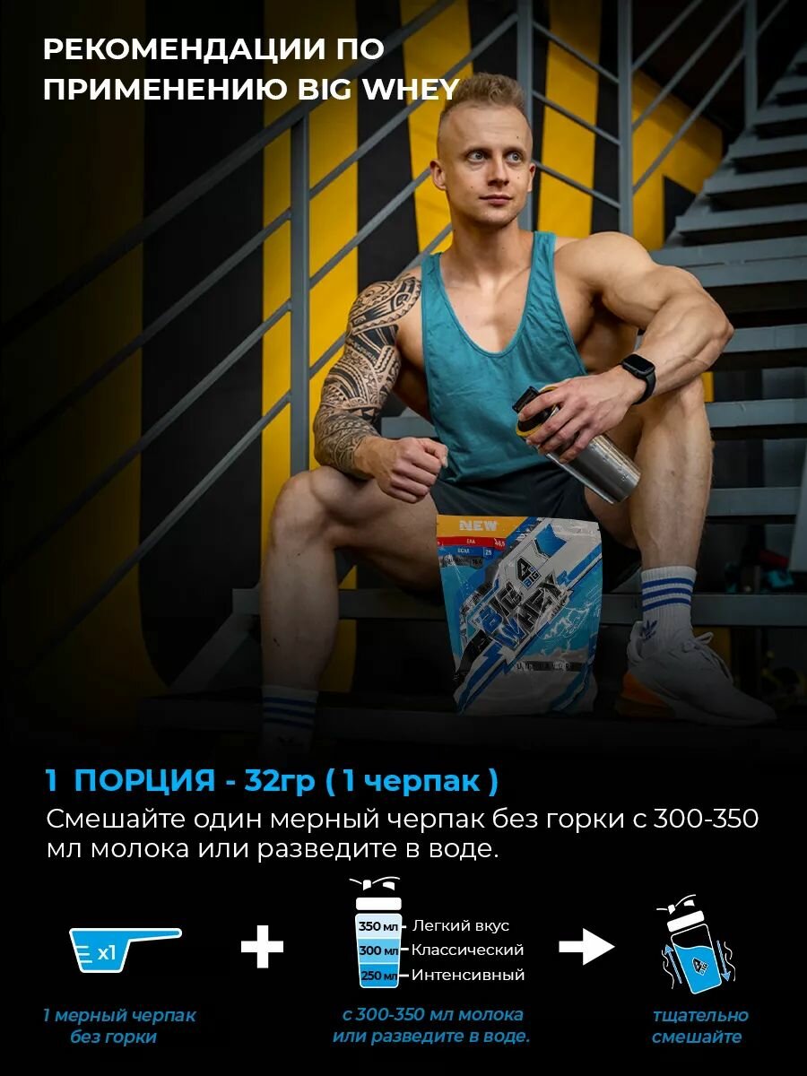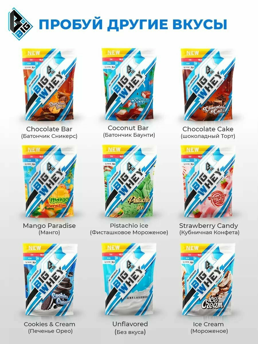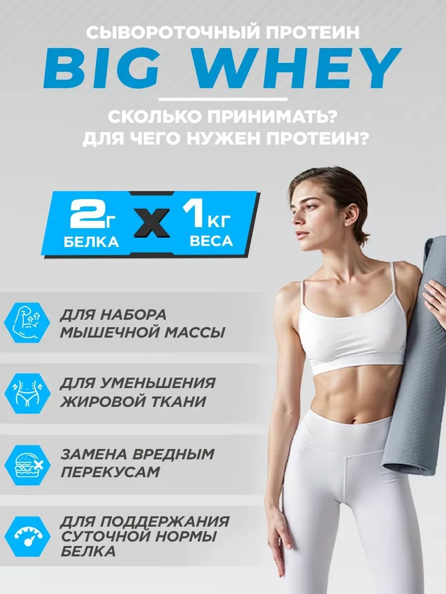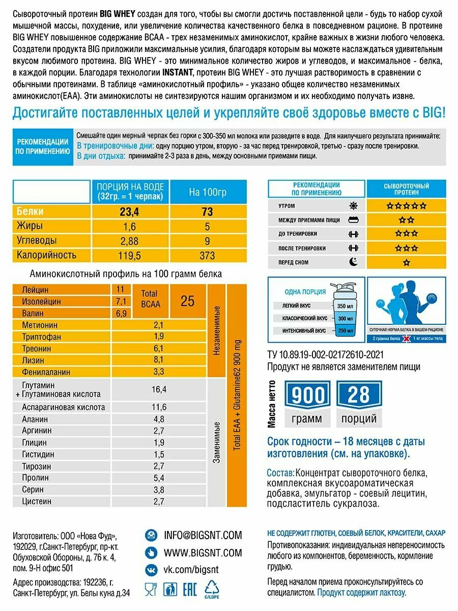 Сывороточный протеин BIG WHEY бренда BIGSNT — это идеальный протеин для набора мышечной массы и снижения веса. Этот whey protein — отличный протеин, который помогает спортсменам и любителям фитнеса добирать качественный белок в ежедневном рационе. Протеиновый коктейль на его основе обладает не только превосходным вкусом, но и высокой питательной ценностью, насыщая организм необходимыми аминокислотами и белком.BIG WHEY — это лучший выбор среди протеинов для активных людей, любящих спорт и стремящихся к быстрому росту сухой мышечной массы. Этот протеин из сывороточного белка отлично подходит для приготовления коктейлей для похудения и для тех, кто хочет сбросить лишний вес, заменяя вредные перекусы вкусным и полезным напитком. В одной порции содержится 23 грамма богатого аминокислотами сывороточного белка, который легко усваивается организмом.Этот протеин без сахара и красителей, он также не содержит глютена и соевого белка. Протеин BIG WHEY бренда BIGSNT — это популярный качественный продукт, который отлично подходит для похудения и набора веса.Протеиновый порошок удобно использовать для приготовления коктейлей для похудения вместо еды или в качестве белкового перекуса. Для этого достаточно развести порцию сухой смеси в молоке или воде. Такой коктейль для похудения помогает организму получать необходимые питательные вещества для роста мышц и снижения массы тела. В комплект входит мерная ложка, а упаковка объемом 900г рассчитана на 28 порций.Протеин для набора мышечной массы для мужчин и женщин, а также протеин для похудения для женщин — это отличное решение для тех, кто хочет укрепить мышцы, повысить выносливость и сбросить лишний вес. Выбирайте любой вариант для своих тренировок! Мы предлагаем широкий ассортимент вкусов нашего протеина: шоколад, ягоды, мороженое, банан, сливочный, ваниль, печенье и множество других вариантов. Каждый найдет свой протеиновый коктейль для похудения.