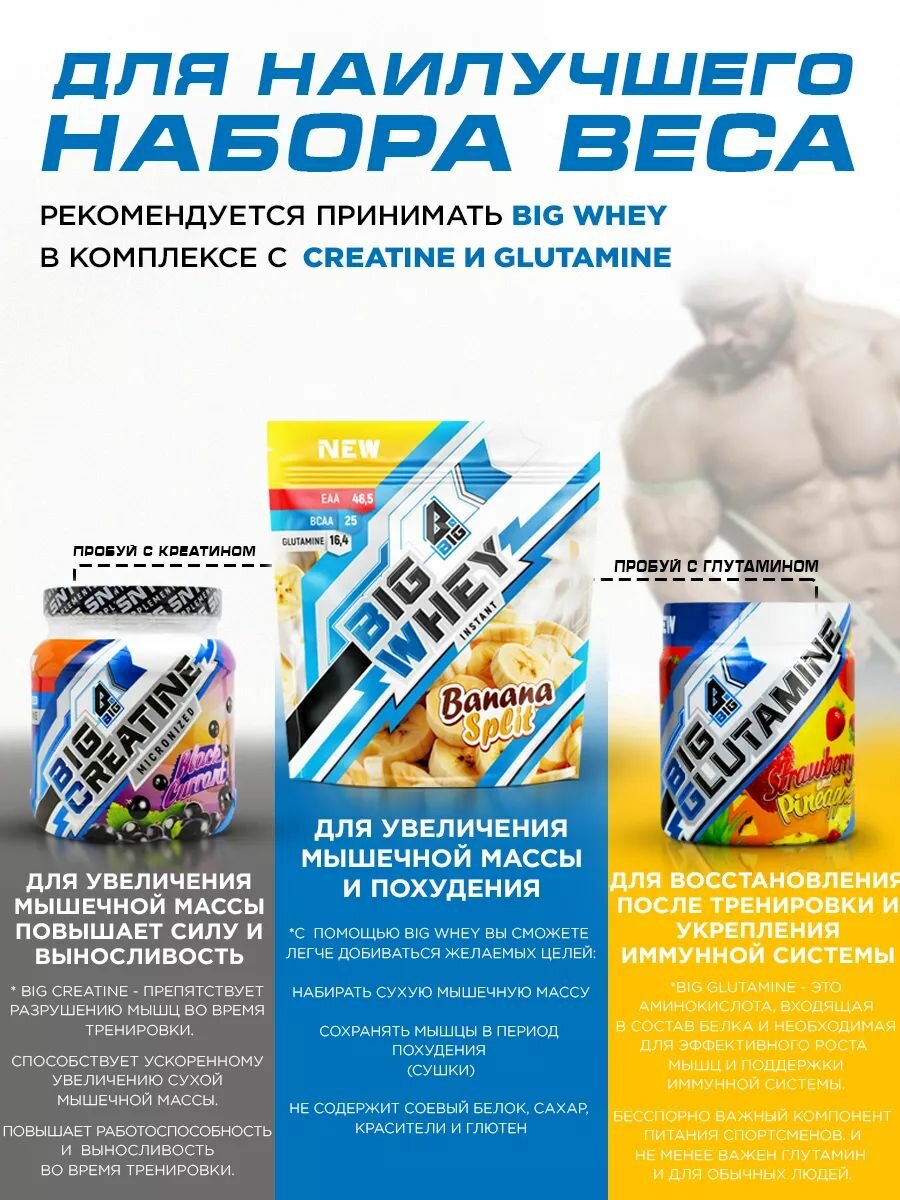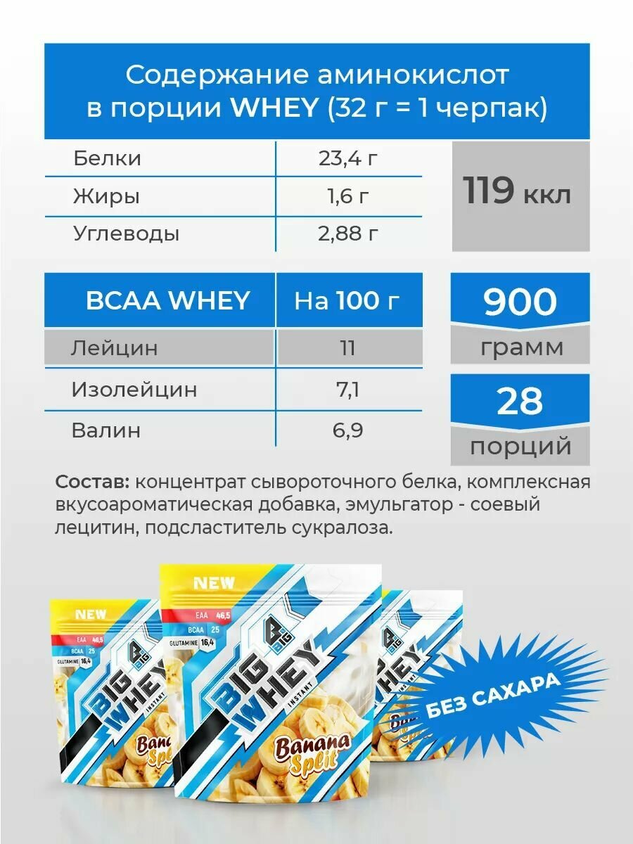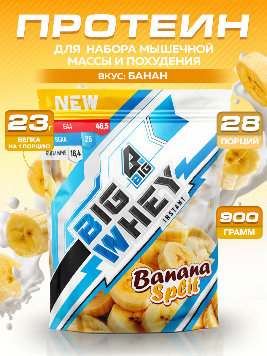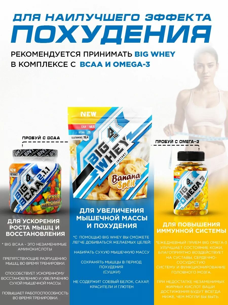 Сывороточный протеин BIG WHEY бренда BIGSNT — это идеальный протеин для набора мышечной массы и снижения веса. Этот whey protein — отличный протеин, который помогает спортсменам и любителям фитнеса добирать качественный белок в ежедневном рационе. Протеиновый коктейль на его основе обладает не только превосходным вкусом, но и высокой питательной ценностью, насыщая организм необходимыми аминокислотами и белком.BIG WHEY — это лучший выбор среди протеинов для активных людей, любящих спорт и стремящихся к быстрому росту сухой мышечной массы. Этот протеин из сывороточного белка отлично подходит для приготовления коктейлей для похудения и для тех, кто хочет сбросить лишний вес, заменяя вредные перекусы вкусным и полезным напитком. В одной порции содержится 23 грамма богатого аминокислотами сывороточного белка, который легко усваивается организмом.Этот протеин без сахара и красителей, он также не содержит глютена и соевого белка. Протеин BIG WHEY бренда BIGSNT — это популярный качественный продукт, который отлично подходит для похудения и набора веса.Протеиновый порошок удобно использовать для приготовления коктейлей для похудения вместо еды или в качестве белкового перекуса. Для этого достаточно развести порцию сухой смеси в молоке или воде. Такой коктейль для похудения помогает организму получать необходимые питательные вещества для роста мышц и снижения массы тела. В комплект входит мерная ложка, а упаковка объемом 900г рассчитана на 28 порций.Протеин для набора мышечной массы для мужчин и женщин, а также протеин для похудения для женщин — это отличное решение для тех, кто хочет укрепить мышцы, повысить выносливость и сбросить лишний вес. Выбирайте любой вариант для своих тренировок! Мы предлагаем широкий ассортимент вкусов нашего протеина: шоколад, ягоды, мороженое, банан, сливочный, ваниль, печенье и множество других вариантов. Каждый найдет свой протеиновый коктейль для похудения.