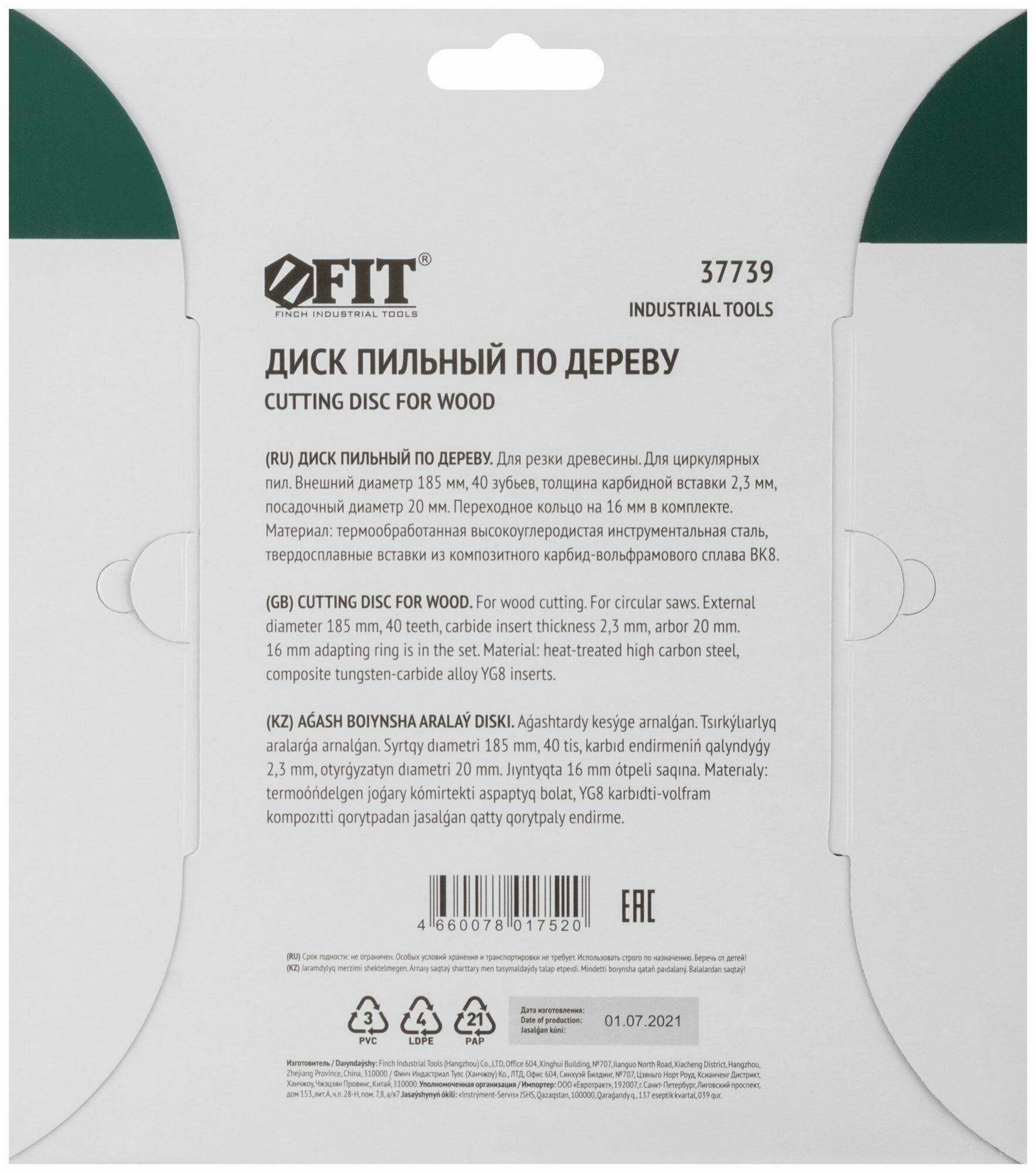 Диск пильный по дереву 185х20 мм 40Т FIT (с карбидными вставками на зубьях)