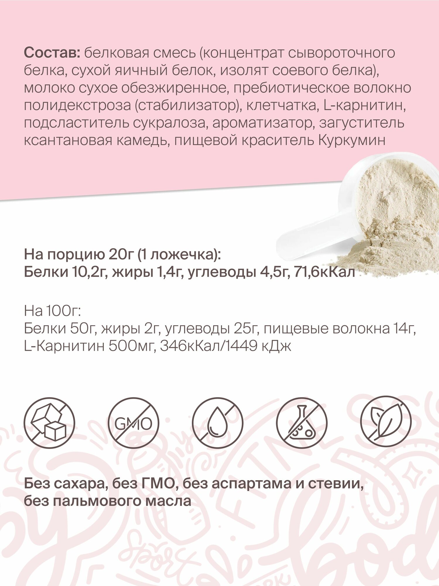 | Состав | Состав: белковая смесь (концентрат сывороточного белка, сухой яичный белок, изолят соевого белка), молоко сухое обезжиренное, пребиотическое волокно полидекстроза (стабилизатор), клетчатка, L-карнитин, подсластитель сукралоза, ароматизатор, загуститель ксантановая камедь |