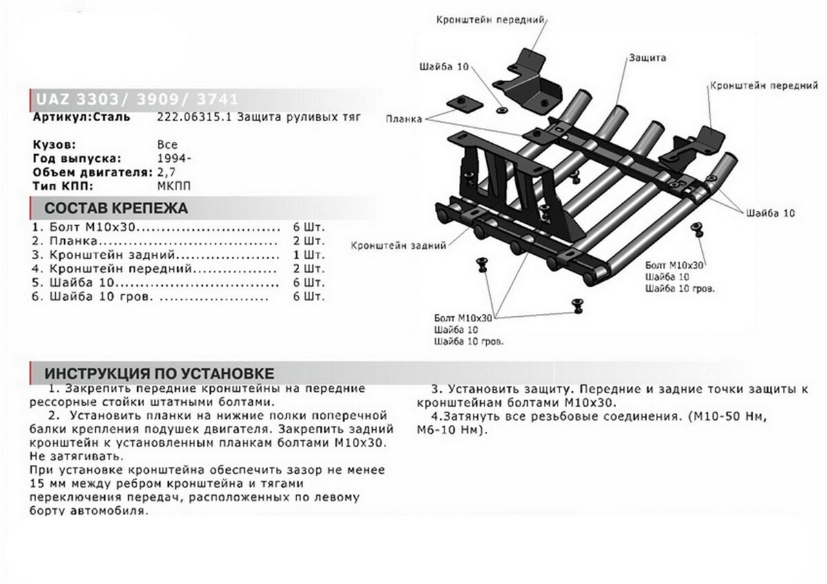 Защита рулевых тяг из трубы Автоброня UAZ 3303/3909/3741 1994, сталь 2,5 мм., комплект крепежа, .