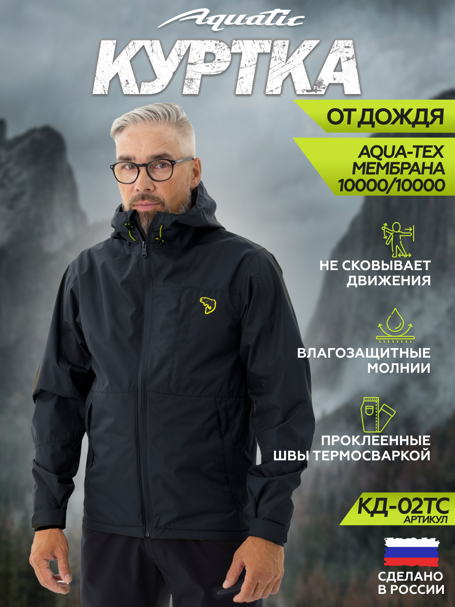 Стильная и функциональная куртка Aquatic КД-02 из высокотехнологичной мембранной ткани AQUA-TEX GT с показателями водонепроницаемости 10000 mw и дышащей способности 10000 mwp защитит вас даже от сильного ливня. Капюшон куртки имеет конструкцию, предназначенную для защиты шеи от ветра, а так же удобную систему регулировки объема. Центральная молния водозащищенная, боковые и нагрудный карманы защищены от дождя клапанами. Есть внутренний карман на молнии. Манжеты регулируются с помощью липучек, плюс внутренние манжеты из эластичного материала. Незаменимая и очень удобная куртка для экстремального отдыха, но благодаря современному дизайну она отлично подойдет и для повседневного использования.Если вы ищете надежную и стильную куртку, которая защитит вас от дождя и ветра, то Aquatic КД-02 - это именно то, что вам нужно. Это мужская куртка, которая идеально подходит для осеннего и весеннего сезонов. Она является демисезонной и подойдет как для повседневного использования, так и для активного отдыха.Внутри куртки есть карман на молнии, который может быть использован для хранения ценных вещей, таких как документы, телефон и т. д.Манжеты куртки регулируются с помощью липучек, и включают в себя внутренние манжеты из эластичного материала. Это обеспечивает дополнительную защиту от воды и ветра, и позволяет вам легко настроить манжеты под себя. Куртка Aquatic КД-02 - это стильная, водонепроницаемая и ветрозащитная куртка, которая идеально подойдет для активного отдыха и повседневного использования. Куртка произведена в России, и бренд гарантирует качество и надежность. Это прекрасный вариант для туристических, рыболовных и охотничьих поездок.