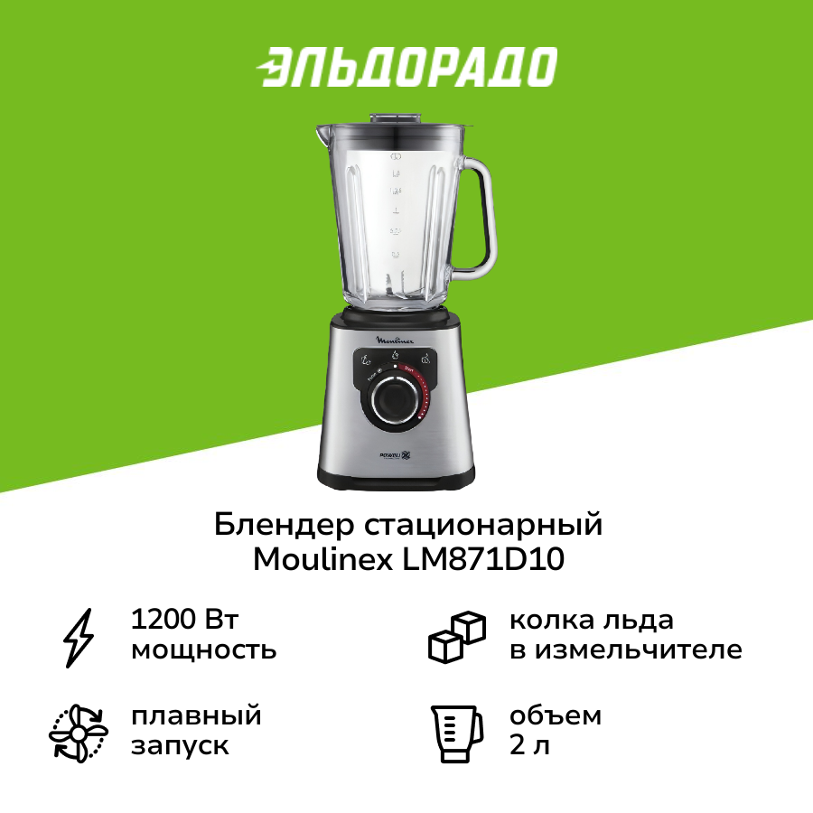 Стационарный блендер Moulinex PerfectMix LM871D10 представляет собой мощный и функциональный стационарный блендер, разработанный для интенсивной домашней кухни. Мощность 1200 Вт в сочетании с шестью лезвиями с технологией Powelix обеспечивает безупречное измельчение даже самых твердых продуктов — от орехов до льда.