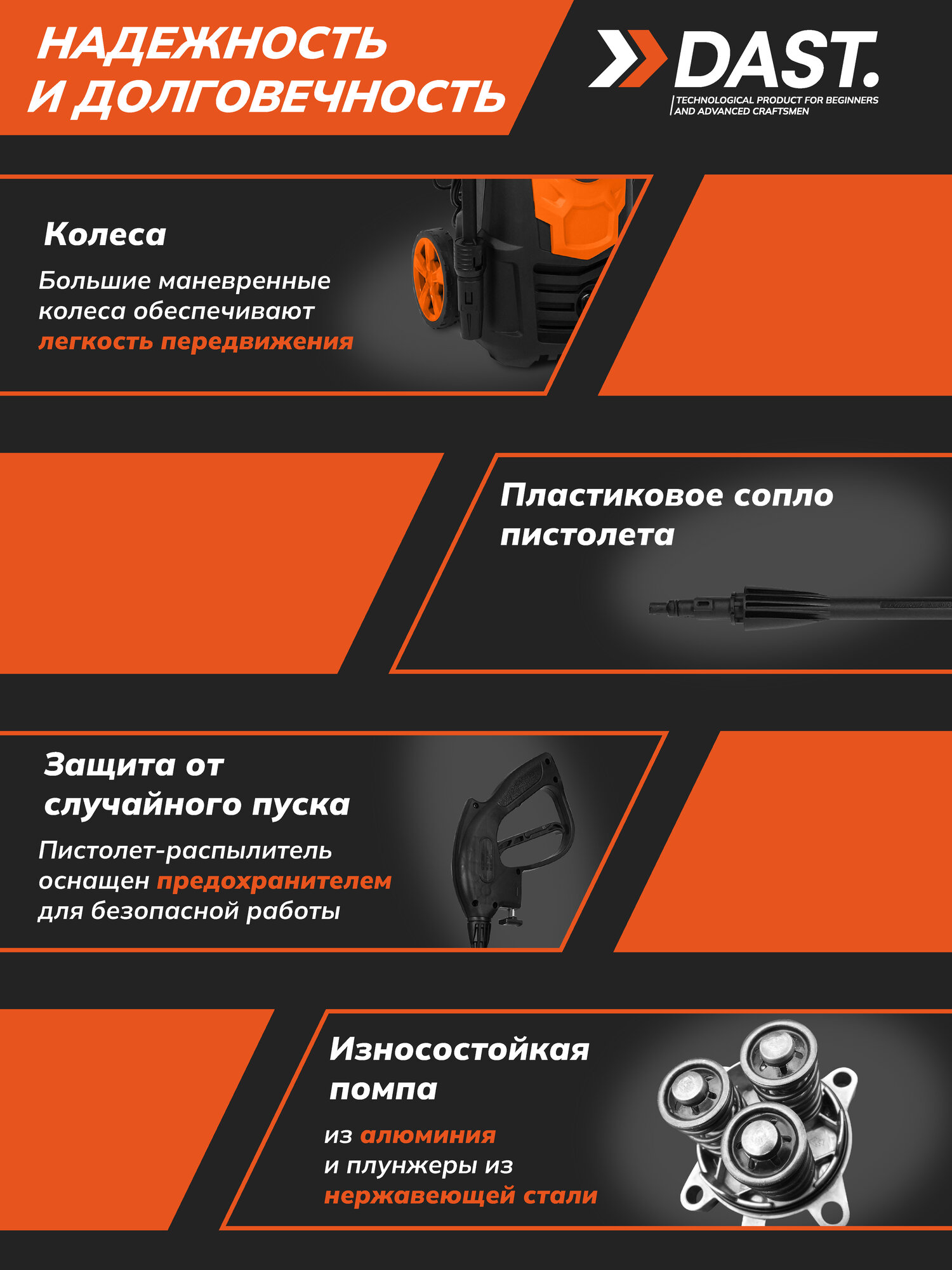 **Мойка высокого давления Dast DMVD-2400S, 190 бар, 430 л/ч** — это мощная, производительная и компактная мойка, предназначенная для удаления сложных загрязнений с помощью струи высокого давления. Благодаря медной обмотке двигателя, она обеспечивает более высокое рабочее давление и продлевает срок службы инструмента.