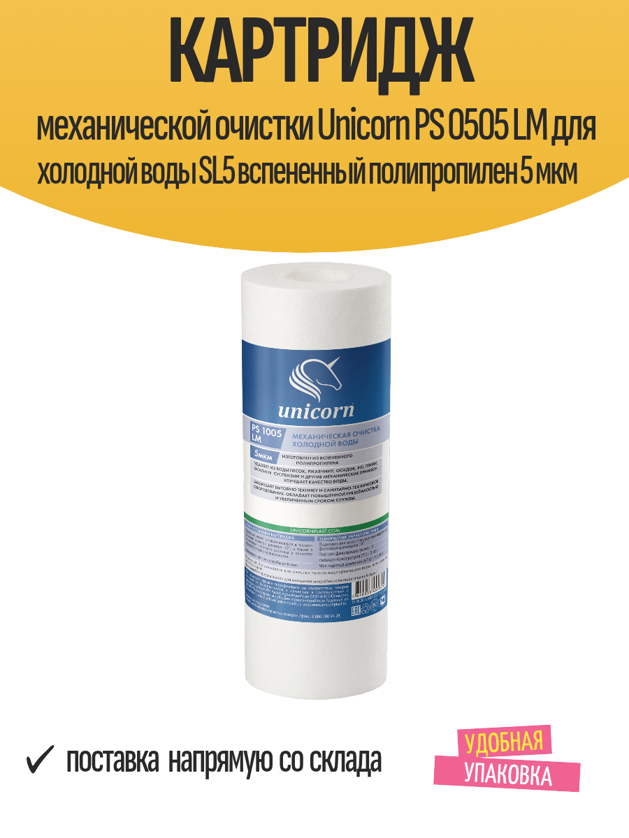 **Картридж механической очистки Unicorn PS 0505 LM SL5** предназначен для дополнительной очистки холодной воды. При длительном простое (от 2 суток) рекомендуется промыть изделие в течение 10 минут и более. Максимальная температура воды в трубопроводе - не более 40°C.
