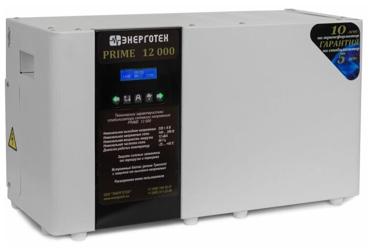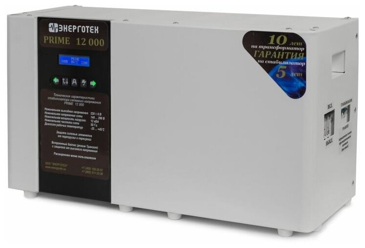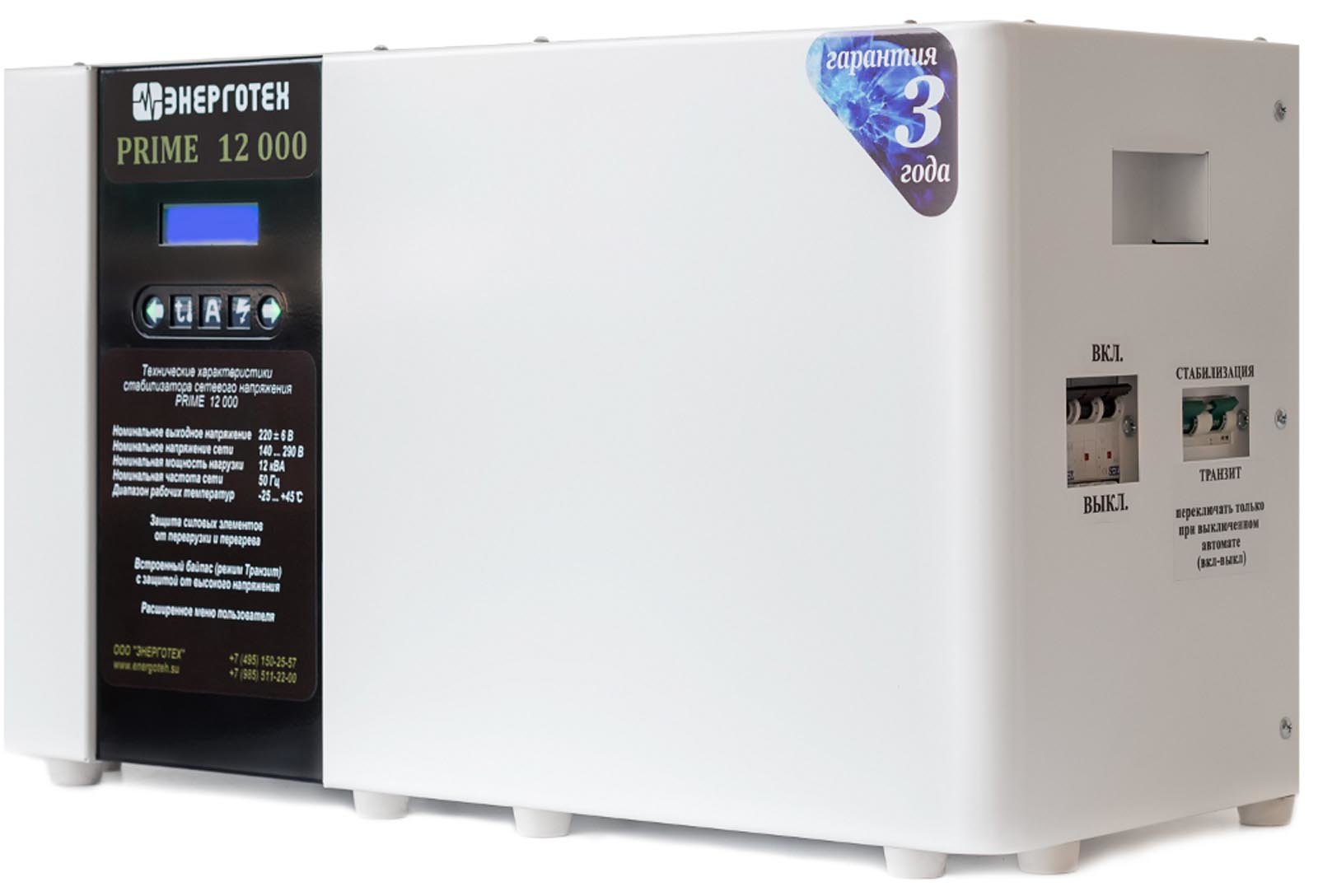 Стабилизатор напряжения высокой точности энерготех PRIME-12000 предназначен для автоматической коррекции напряжения в нагрузке и рассчитан на непрерывную работу в сетях электроснабжения с номинальным фазным напряжением 220 вольт. Функционально стабилизатор является автоматическим регулятором напряжения ступенчатого типа. Он состоит из автотрансформатора, блока тиристорных ключей, платы управления и жидкокристаллического индикатора.
