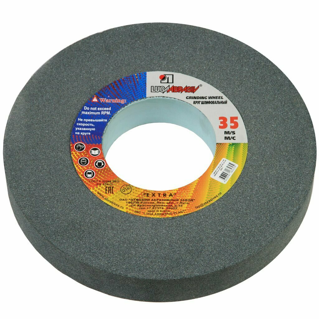 Диск для точила предназначен для абразивной обработки деталей на заточном или шлифовальном станке. Диск изготовлен из зеленого карбида кремния (63С), подходит для шлифования поверхностей, изготовленных из твердых материалов с низким сопротивлением разрыву (чугун, бронза, латунь, твердые сплавы, стекло, мрамор, гранит), а также очень вязких материалов (жаропрочных сталей, сплавов меди и алюминия). Диск обладает средней твердостью. Связка - керамическая, имеет такие свойства как огнеупорность, водостойкость, химическая стойкость и относительно высокая стойкость.Для всех видов шлифования деталей и конструкций из чугуна, цветных металлов, природного и искусственного камня, стекла, фарфора, заточки твердосплавного режущего инструмента, правки шлифовальных кругов.Тип круга: 1 (прямой профиль).Допустимая скорость вращения: 1950 об/мин.D (наружный диаметр): 350 мм.T (высота): 50 мм.H (диаметр отверстия): 127 мм.Твердость: среднетвердые.Зернистость: 60.Скорость вращения: 35 м/с.Материал: 63С (карбид кремния зеленый).Лужский абразивный завод является одним из крупнейшим в мире производителем абразивного инструмента. Деятельность предприятия направлена на постоянное техническое совершенствование выпускаемых изделий, поэтому продукция соответствует всем санитарным нормам и требованиям.