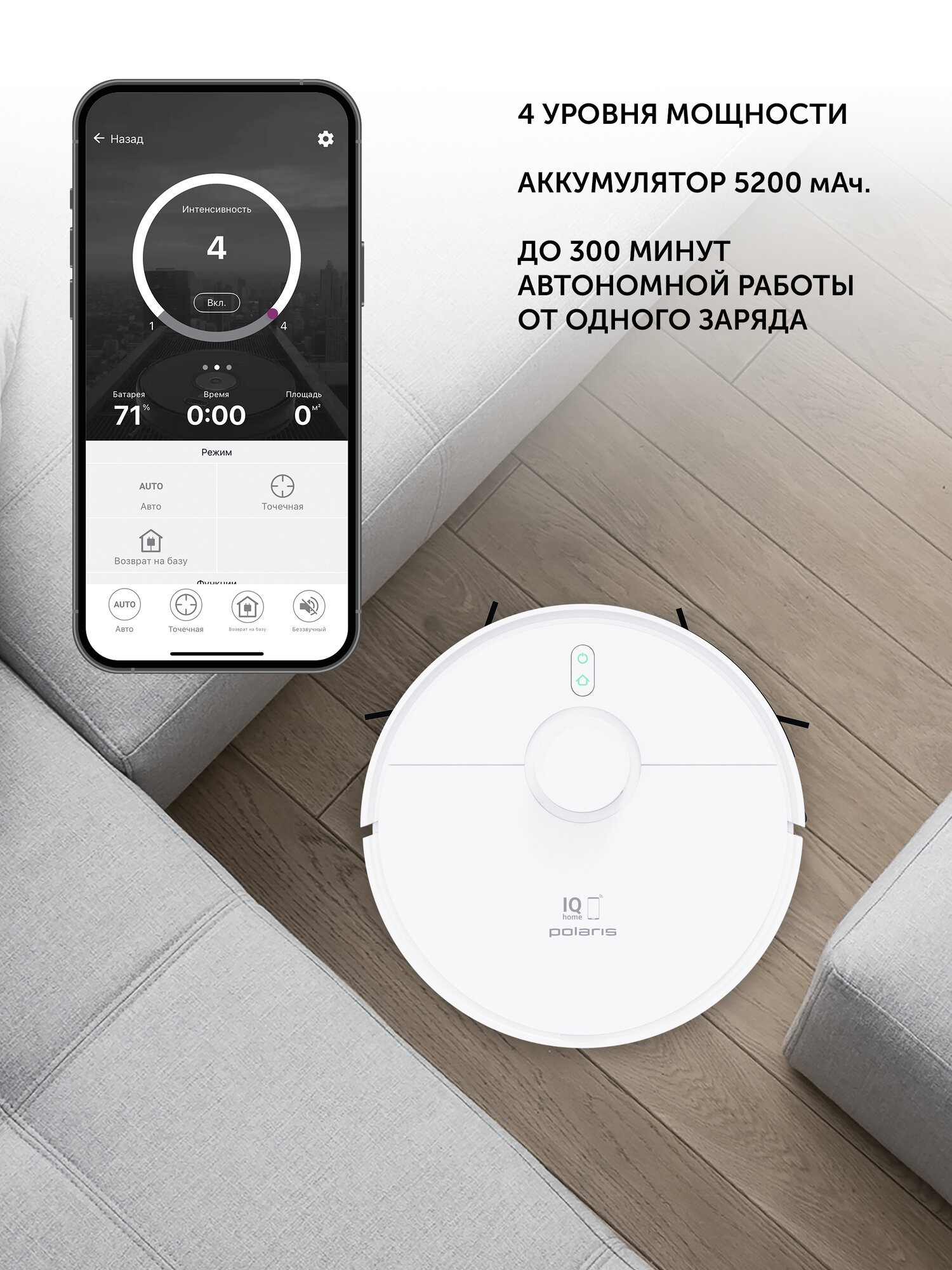 Li-ion батарея 3200 мАч - площадь уборки 150 м² на одной зарядке.