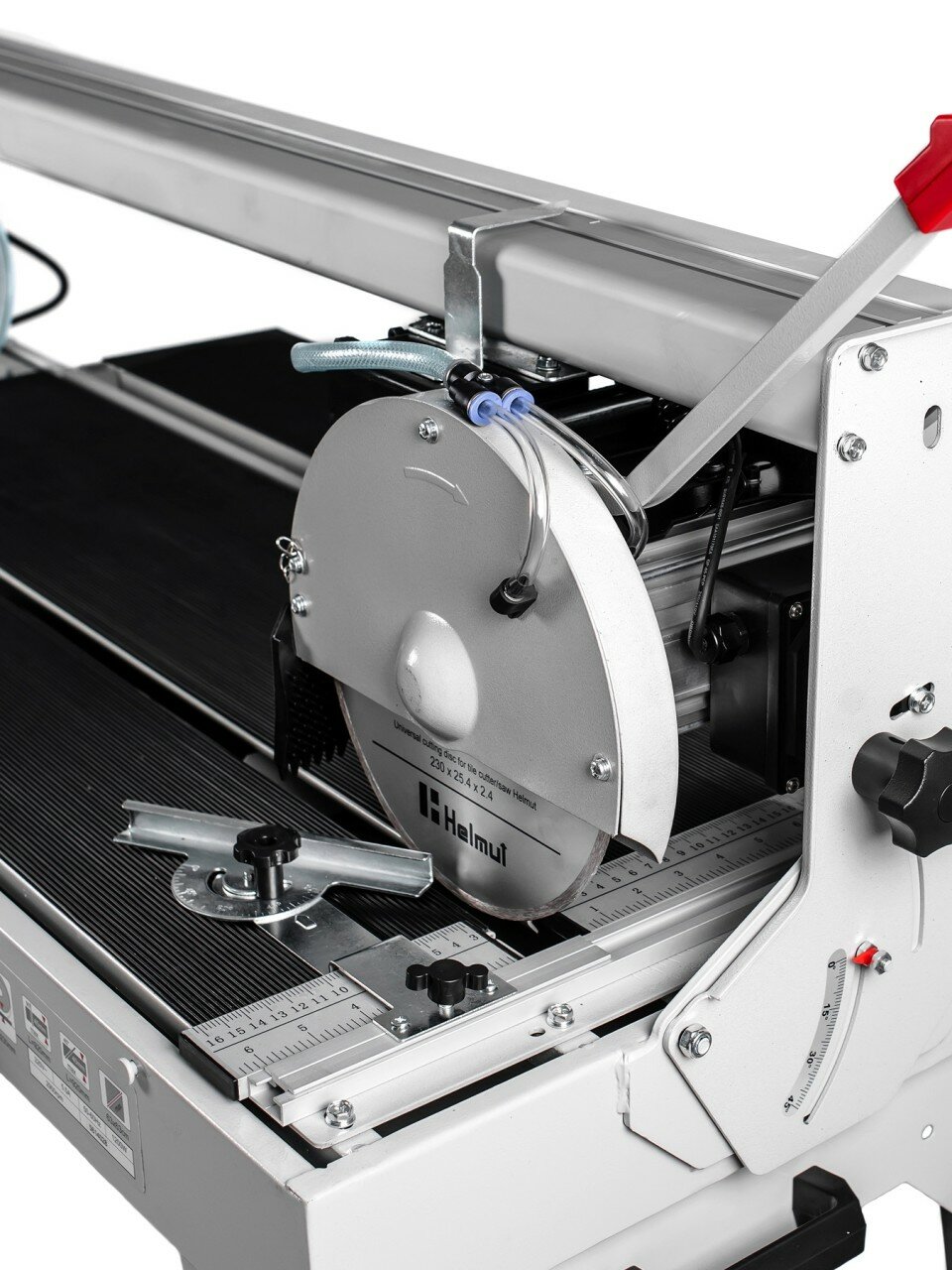 Плиткорезный станок электрический Helmut FS230H с верхней направляющей, предназначен для резки облицовочной или тротуарной плитки. Станок имеет водяное охлаждение. Размер стола 960 x 400 мм., позволяет осуществлять рез длинной до 920 мм., а верхняя направляющая дает возможность делать пропилы под углом 45° на глубину до 40 мм. Удобная транспортировка достигается благодаря убирающемся опорам. Данная модель электрического плиткореза имеет жесткую раму и надежные опоры, что обеспечивает большую устойчивость.