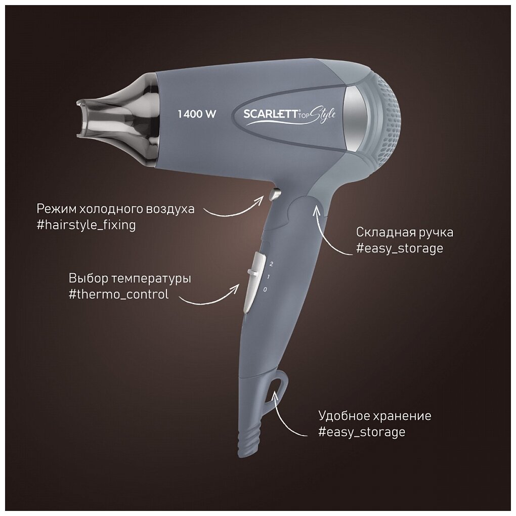 Scarlett SC-074 серый Мощ:1400 Вт Корпус из термост. пласт. 2 режима температуры потока воздуха 2 режима мощности потока воздуха Насадка-концентратор для укладки волос Холодный обдув для завершения укладки и фиксации прически Складная ручка Авто отключение при перегреве