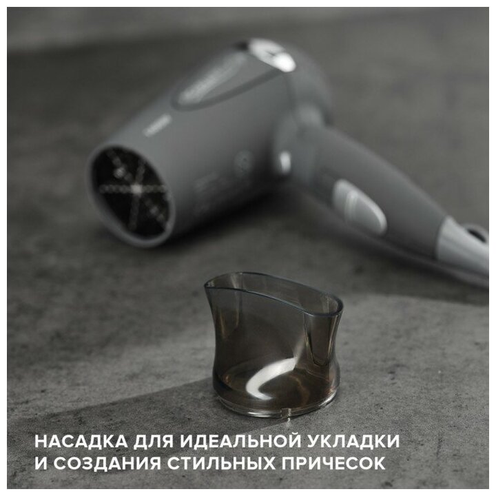 Мощ:1400 Вт Корпус из термост. пласт. 2 режима температуры потока воздуха 2 режима мощности потока воздуха Насадка-концентратор для укладки волос Холодный обдув для завершения укладки и фиксации прически Складная ручка Авто отключение при перегреве Защита