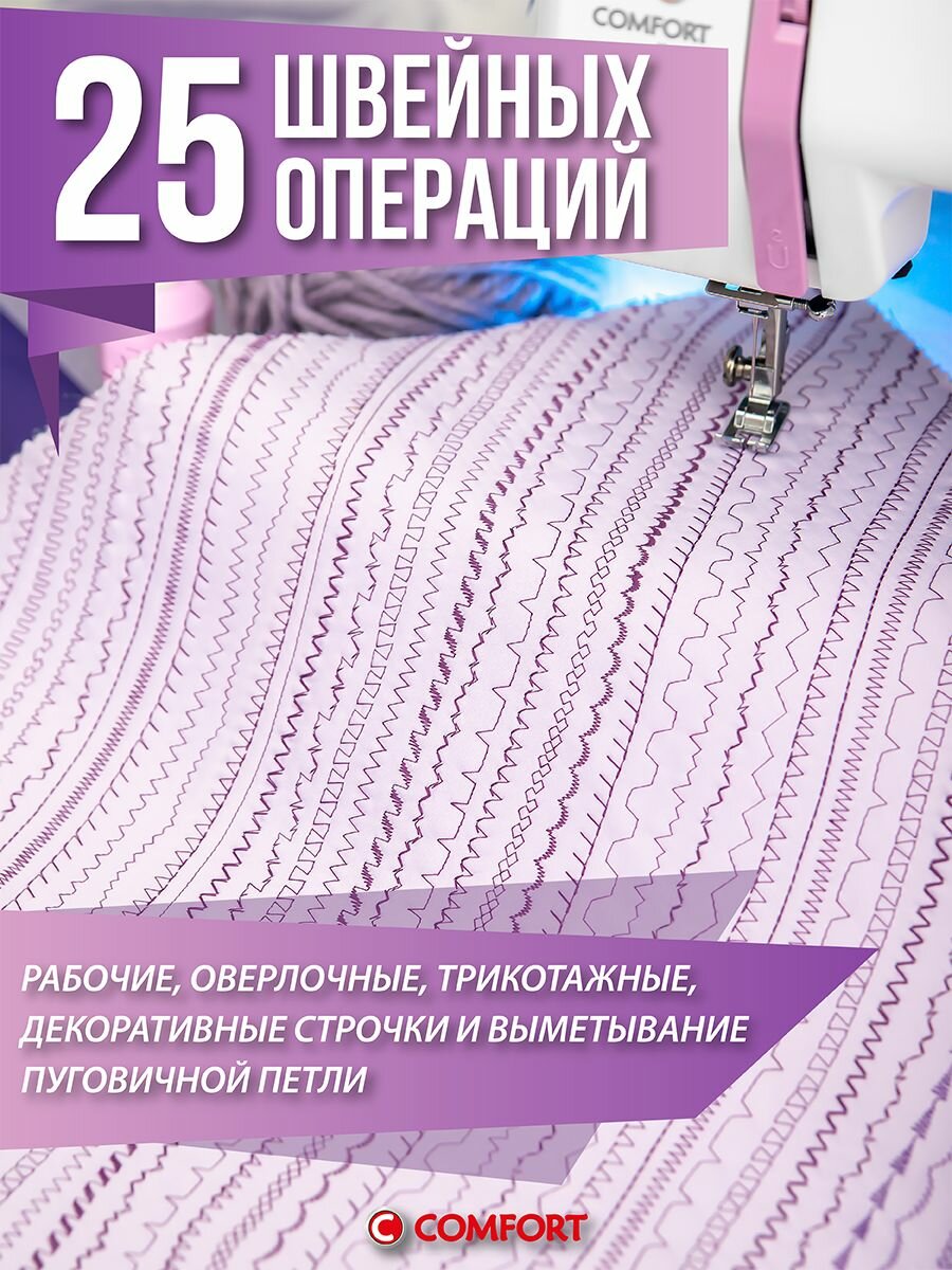 Комфортное шитье – у Вас дома! Швейные машины серии Comfort компактны и просты в использовании. Наличие таких функций как автоматизированная заправка верхней нити и устройство быстрой установки шпульки значительно упрощают работу на машине. Широкий выбор строчек «зиг-заг» позволяет обрабатывать трикотажные и прочие эластичные ткани. Модель проста в использовании, имеет необходимый набор рабочих операций и предназначена для ремонта одежды.