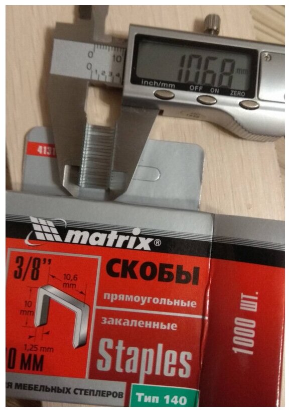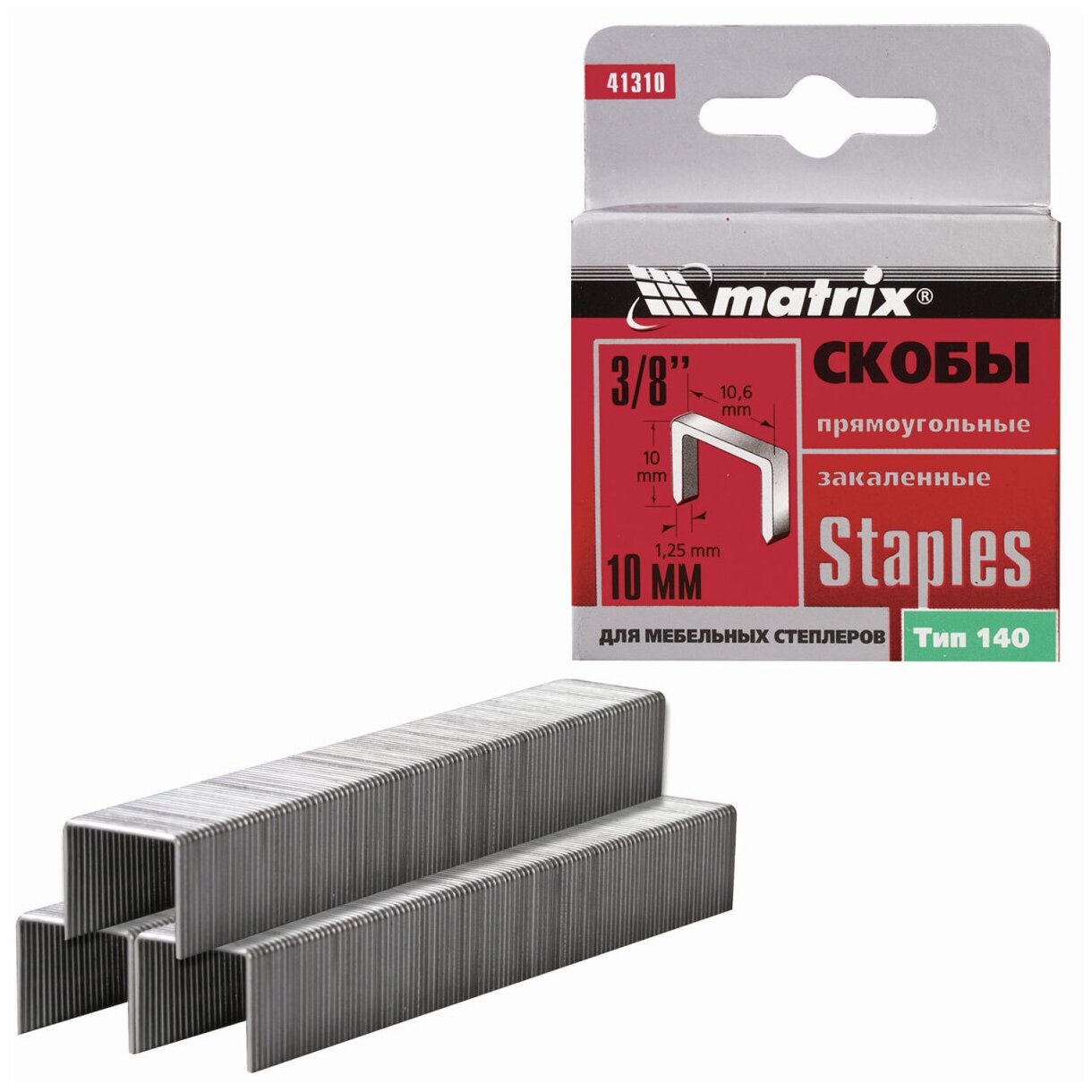 Тип: Скобы для степлера; Тип скобы: 140; Высота: 10 мм; Количество в упаковке: 1000 шт; Описание: Скобы для мебельного степлера изготовлены из углеродистой стали. Закалены. Тип 140. Ширина скобы – 10,6 мм, толщина – 1,25 мм. Используется в комплекте со степлером для крепления тканей, листовых материалов из пород дерева, оргалита к основе из дерева, ДСП и т.п. Подходят для степлеров Matrix моделей №№ 40901, 40905.
