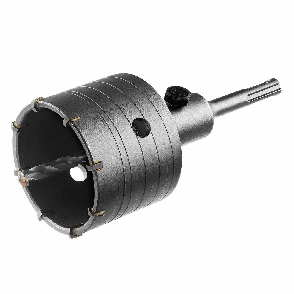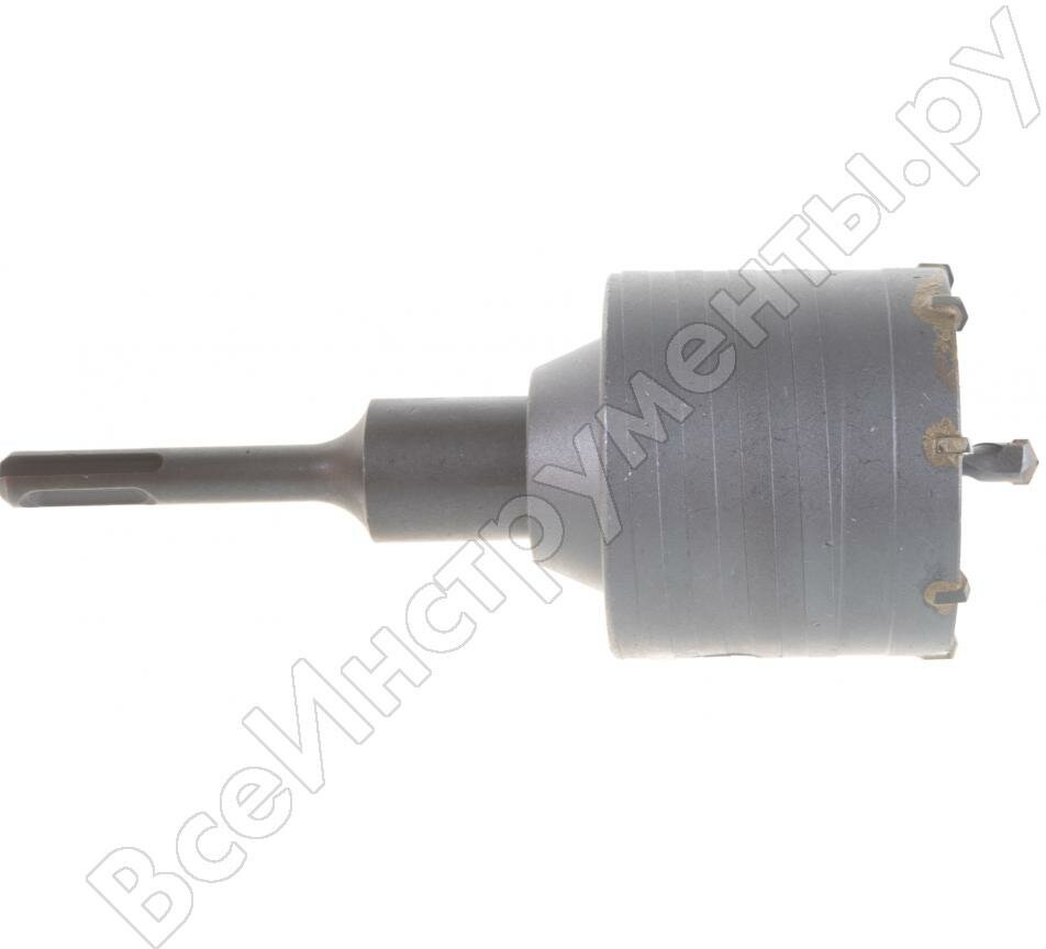 На внешней стороне коронки нарезана спиральная канавка для улучшения вывода продуктов сверления и снижения нагрузки на перфоратор. Твердосплавные зубья из сплава марки ВК8. Корпус коронки изготовлен из углеродистой стали. Хвостовик SDS-PLUS. Резьбовое крепление коронки к хвостовику.