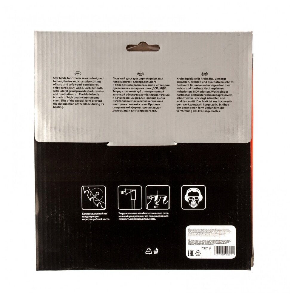 Пильный диск MATRIX Professional произведен с помощью специальная схемы заточки твердосплавных зубьев (ВК4), что позволяет производить качественную распиловку древесины. Компенсационные прорези уменьшают колебания, подавляют шумы и препятствуют изгибанию диска при нагреве.