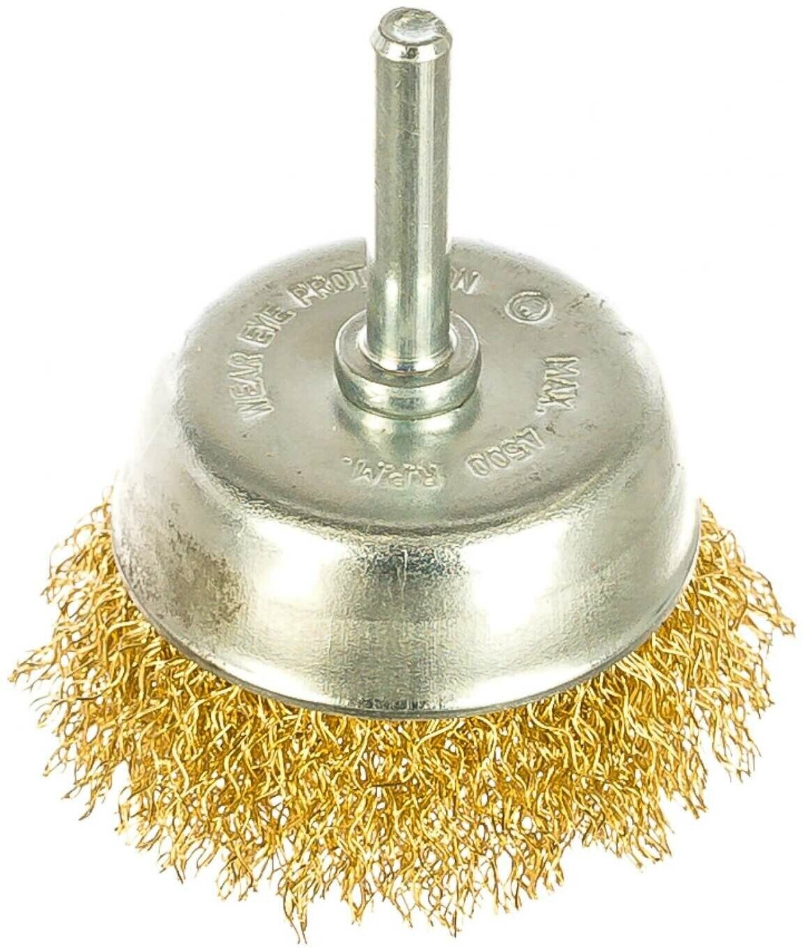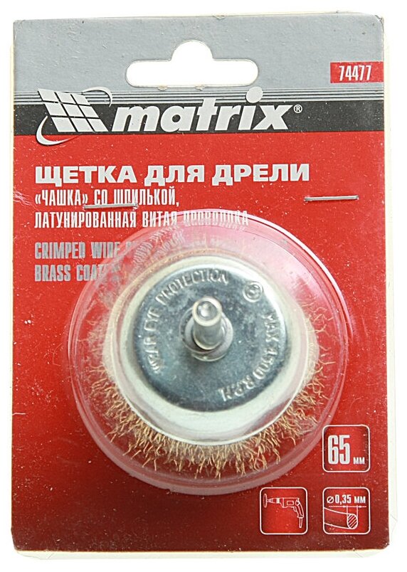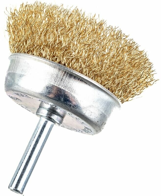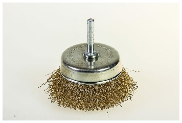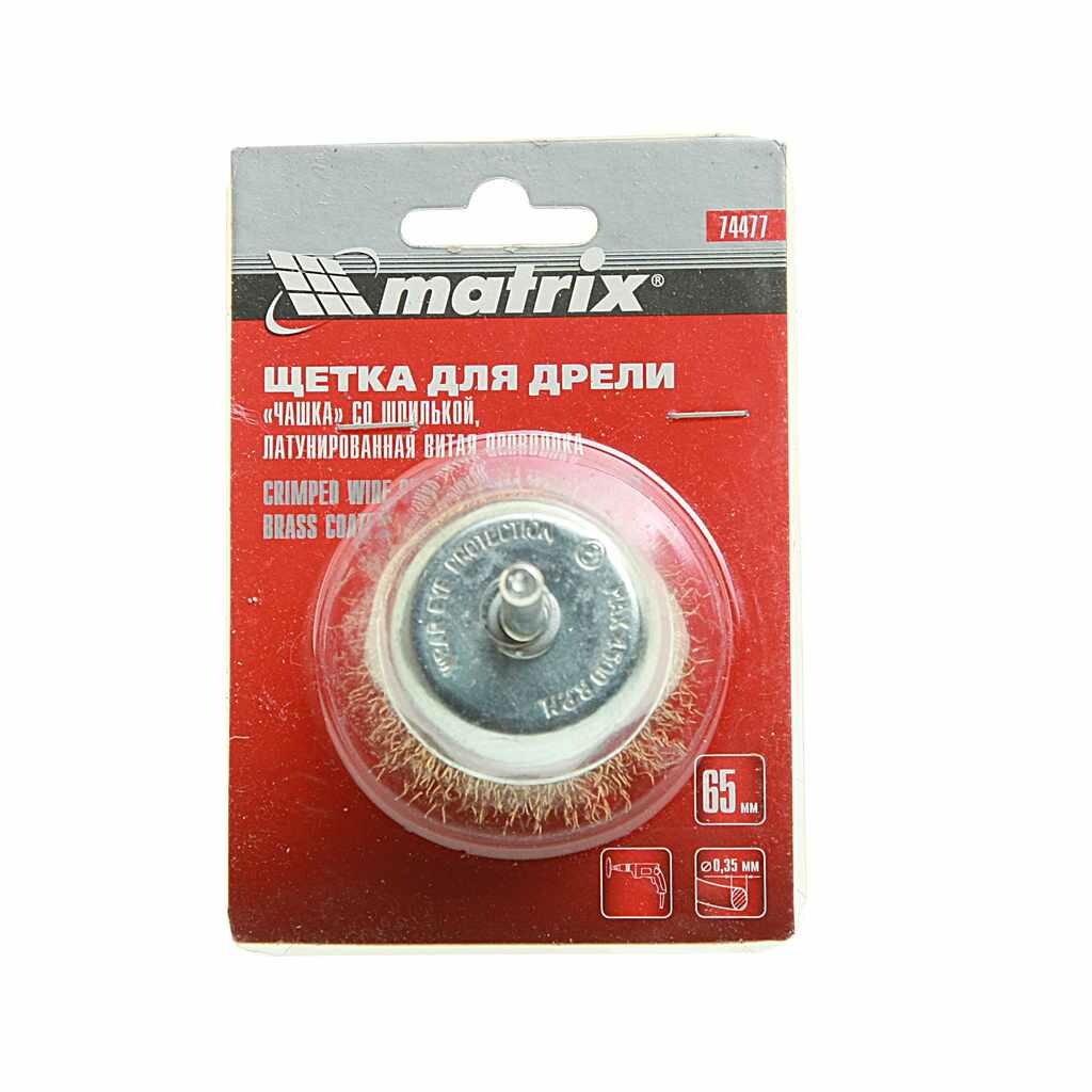 Щетка для дрели «чашка» Matrix диаметром 65 мм, со шпилькой, с щетиной из латунированной витой проволоки, используется для очистки металлических, деревянных и пластиковых поверхностей от незначительных загрязнений и остатков лакокрасочных покрытий. Помогает подчеркнуть структуру материала или придать ему шероховатость. Форма чашки позволяет обрабатывать плоские участки большой площади. Хвостовик диаметром 6 мм устанавливается в патрон электродрели, поддерживающей скорость 4500 об/мин. Во время работы нужно использовать средства индивидуальной защиты — респиратор, очки, наушники, спецодежду и обувь. ПреимуществаВитая проволока сохраняет свою форму после снятия нагрузок, поэтому щетка подходит для интенсивного использования. Латунированное покрытие щетины и цинковое — корпуса обеспечивают защиту щетки от коррозии. Оснастка изготовлена на крупном заводе со строгим контролем качества на всех этапах производства, что подтверждает ее надежность. Щетка пригодится как профессиональным, так и домашним мастерам.