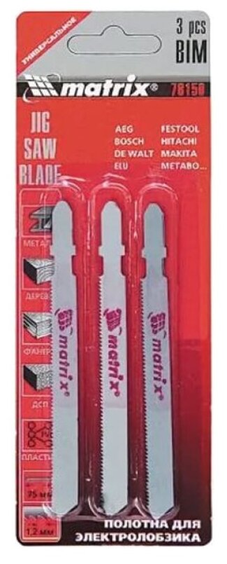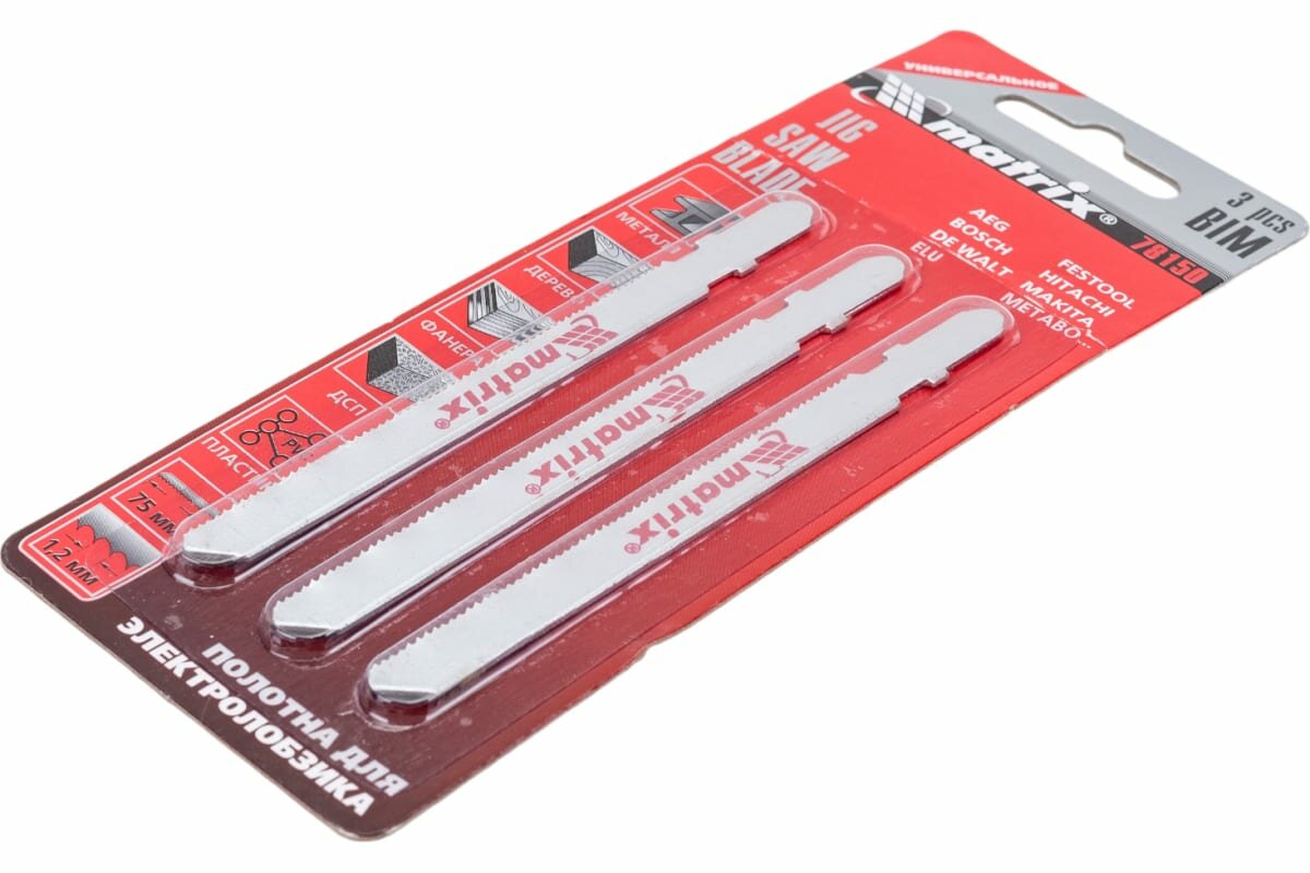 Универсальные полотна для электролобзика Matrix с шагом зубьев 1,2 мм, с EU-хвостовиком, биметаллические (BIM), имеют рабочую длину 75 мм и входят в комплект из 3 шт. Подходят для пиления пластика, металла, фанеры, древесины, ДСП. Мелкие зубья с шагом 1,2 мм позволяют произвести точный и гладкий распил. Полотна будут полезны во время ремонта, производства и сборки мебели, пригодятся в слесарной и столярной мастерской, а также в быту.