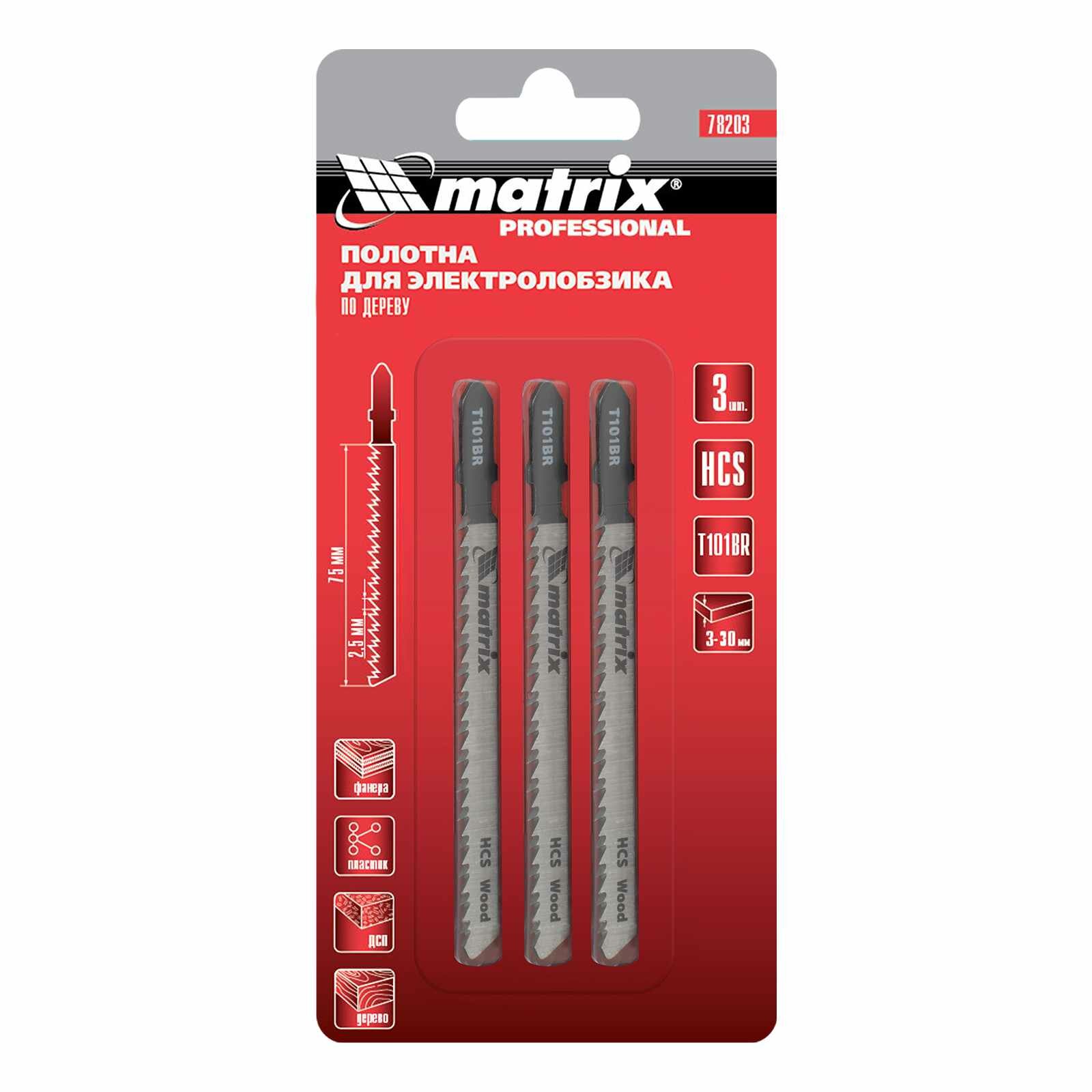 Полотна по дереву Matrix , T101BR, 75 х 2,5 мм, с обратным зубом, HCS, ? комплект оснасток для электролобзика из 3 шт. Предназначены для прямого реза фанеры, древесины, ДСП, ДВП и пластика толщиной от 3 до 30 мм. Имеют стандартный Т-образный хвостовик, совместимый с держателями большинства современных моделей электролобзиков. Обратное направление зубьев позволяет чисто распиливать заготовки с лицевой стороны. Полотна используются при проведении профессиональных столярных работ, а также будут полезны в быту.ПреимуществаПилки из высокоуглеродистой стали У8 характеризуются прочностью и износостойкостью.Режущие кромки, закаленные в вакуумной печи до твердости 48-52 HRC, устойчивы к истиранию и обладают высоким ресурсом.Зубья с шагом 2.5 мм обеспечивают тонкий и чистый распил.Полотна, изготовленные на узкоспециальном оборудовании с применением новейших технологий, отличаются высоки