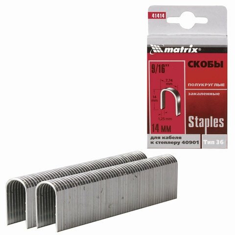 Тип: Скобы для степлера; Высота: 14 мм; Описание: Скобы для кабеля изготовлены из углеродистой стали., Закалены., Толщина скобы 1,25 мм., Подходят для степлеров Matrix моделей №№ 40901, 40905 для крепления низковольтного кабеля.