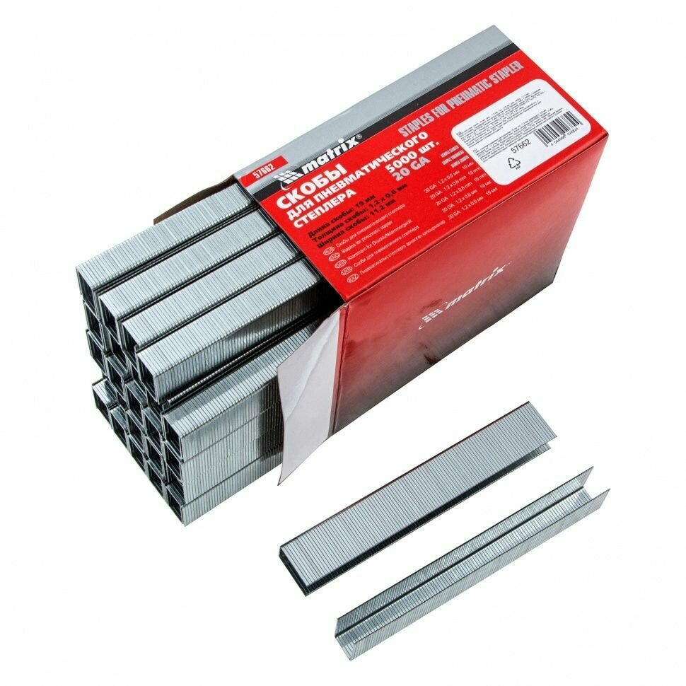 Скоба MATRIX является сменным элементом для пневматического степлера. Применяется в мебельном производстве или строительстве для крепления ткани, пластика к дереву, ДСП и другим аналогичным материалам. Изготовлена из углеродистой стали. Имеет никелевое покрытие. Ширина перемычки — 11.2 мм, длина — 19 мм, ширина — 1.2 мм, толщина — 0.6 мм.