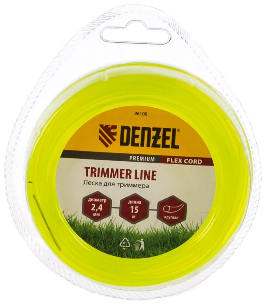 | Прочие особенности и свойства | Леска для триммеров DENZEL 96180 двухкомпонентная круглая 2.4ммх15м extra cord Леска EXTRA CORD применяется в качестве режущего материала в электрических и бензиновых триммерах. Катушка с леской длиной 15 м и диаметром сечения 2,4 мм изготовлена из двухкомпонентного материала, обладает высокой износостойкостью за счет более прочного внутреннего слоя. Леска рекомендована для скашивания как густой зеленой травы, так и сухого многолетнего кустарника. |
