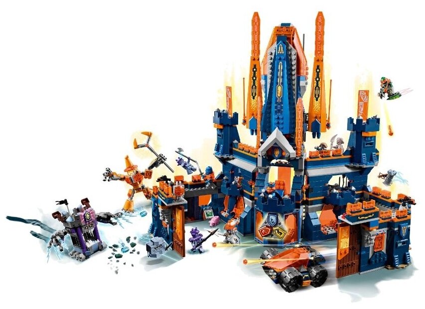Lego Nexo Knights Королевский замок Найтон - набор, который сможет заинтересовать вашего ребенка. Благополучие королевства Найтония и по сей день волнует многих: все хотят заиметь кусочек благополучия и счастья. Именно поэтому доблестные рыцари были не удивлены войскам врага на подступах к их величественному замку - сердцу королевства. Отвлеки противника мощными шипометами для того, чтобы воспользоваться их оплошностью и выпустить мощную машину Робина! В набор входят щиты для сканирования Nexo Сил «Держи ритм», «Дух лисицы», «Весёлая тыква», «Гамма-лучи» и «Атака кентавра», а также «Жгучая лава». Lego Nexoknights - современное и высокотехнологичное поколение рыцарей.