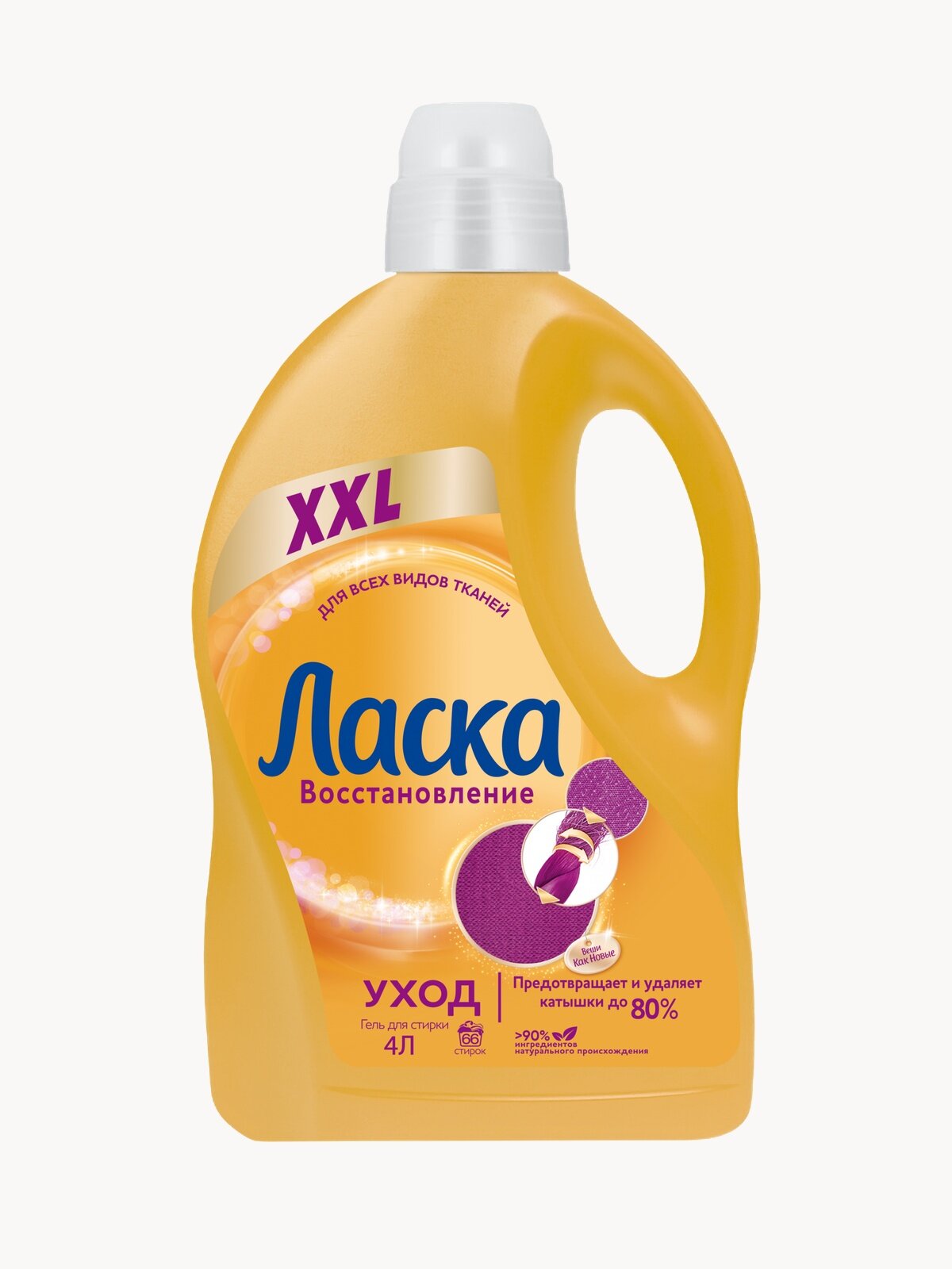 Гель для стирки Ласка Восстановление Синтетика и Спорт. Ласка Восстановление Синтетика и Спорт - это гель для бережной стирки, предназначенный для ухода за синтетическими тканями и спортивными вещами. Он эффективно и бережно отстирывает загрязнения на одежде, нейтрализуя неприятные запахи и сохраняя форму и эластичность ткани. ПРЕИМУЩЕСТВА ГЕЛЯ ДЛЯ СТИРКИ ЛАСКА: Сохраняет свежесть до 24 часов Нейтрализует неприятные запахи, включая запах пота Сохраняет форму и эластичность ваших вещей, чтобы они выглядели как новые дольше Бережно отстирывает загрязнения Гель Ласка удобен в использовании: дозируйте жидкое средство согласно инструкции, заливайте его в отделение для стирального порошка или добавьте мерный колпачок со средством в барабан стиральной машины.