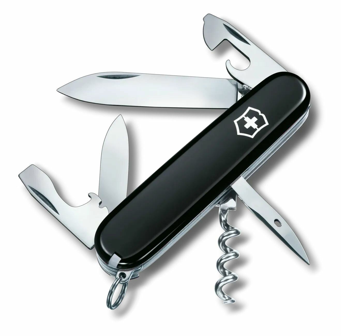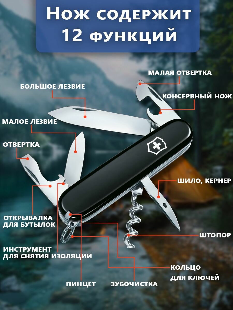 | Функции | большое лезвие, малое лезвие, штопор, консервный нож, отвёртка, маленькая отвертка, открывалка для бутылок, инструмент для снятия изоляции, шило, кольцо для ключей, пинцет, зубочистка |
